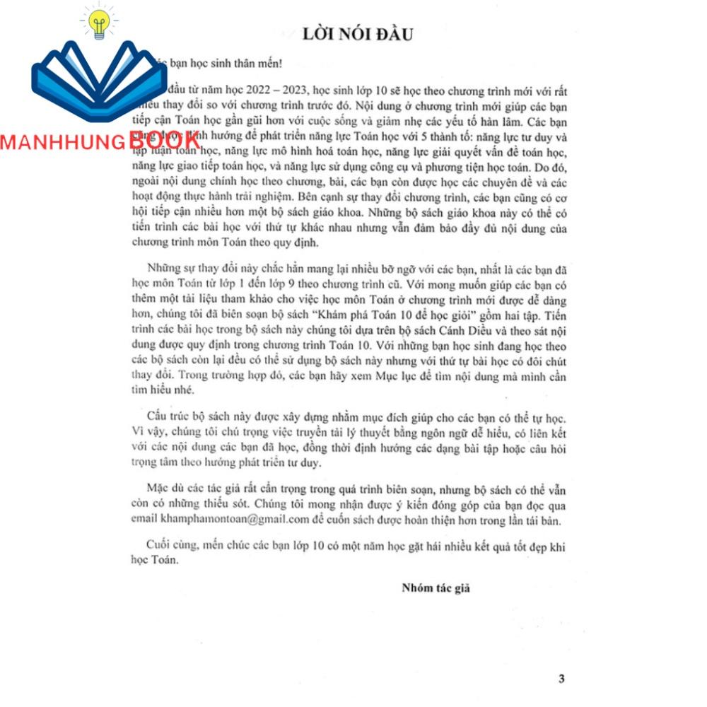 Bắt đầu từ năm học 2022 - 2023, học sinh lớp 10 sẽ học theo chương trình mới với rất nhiều thay đổi so với chương trình trước đó. Nội dung ở chương trình mới giúp các bạn tiếp cận Toán học gần gũi hơn với cuộc sống và giảm nhẹ các yếu tố hàn lâm. Các bạn cũng được định hướng để phát triển năng lực Toán học với 5 thành tố: năng lực tư duy và lập luận toán học, năng lực mô hình hóa toán học, năng lực giải quyết vấn đề toán học, năng lực giao tiếp toán học, và năng lực sử dụng công cụ và phương tiện học toán. Do đó, ngoài nội dung chính học theo chương, bài, các bạn còn được học các chuyên đề và các hoạt động thực hành trải nghiệm. Bên cạnh sự thay đổi chương trình, các bạn cũng có cơ hội tiếp cận nhiều hơn một bộ sách giáo khoa. Những bộ sách giáo khoa này có thể có tiến trình các bài học với thứ tự khác nhau nhưng vẫn đảm bảo đầy đủ nội dung của chương trình môn Toán theo quy định.