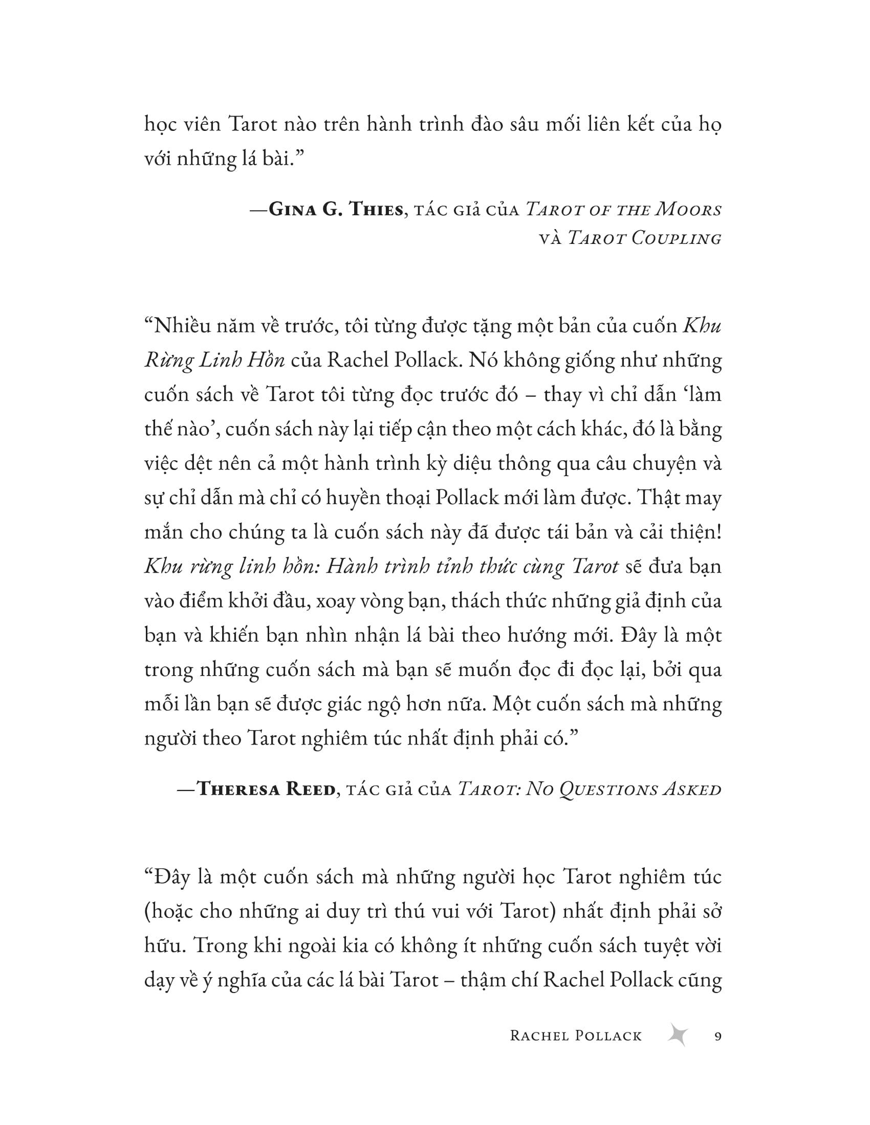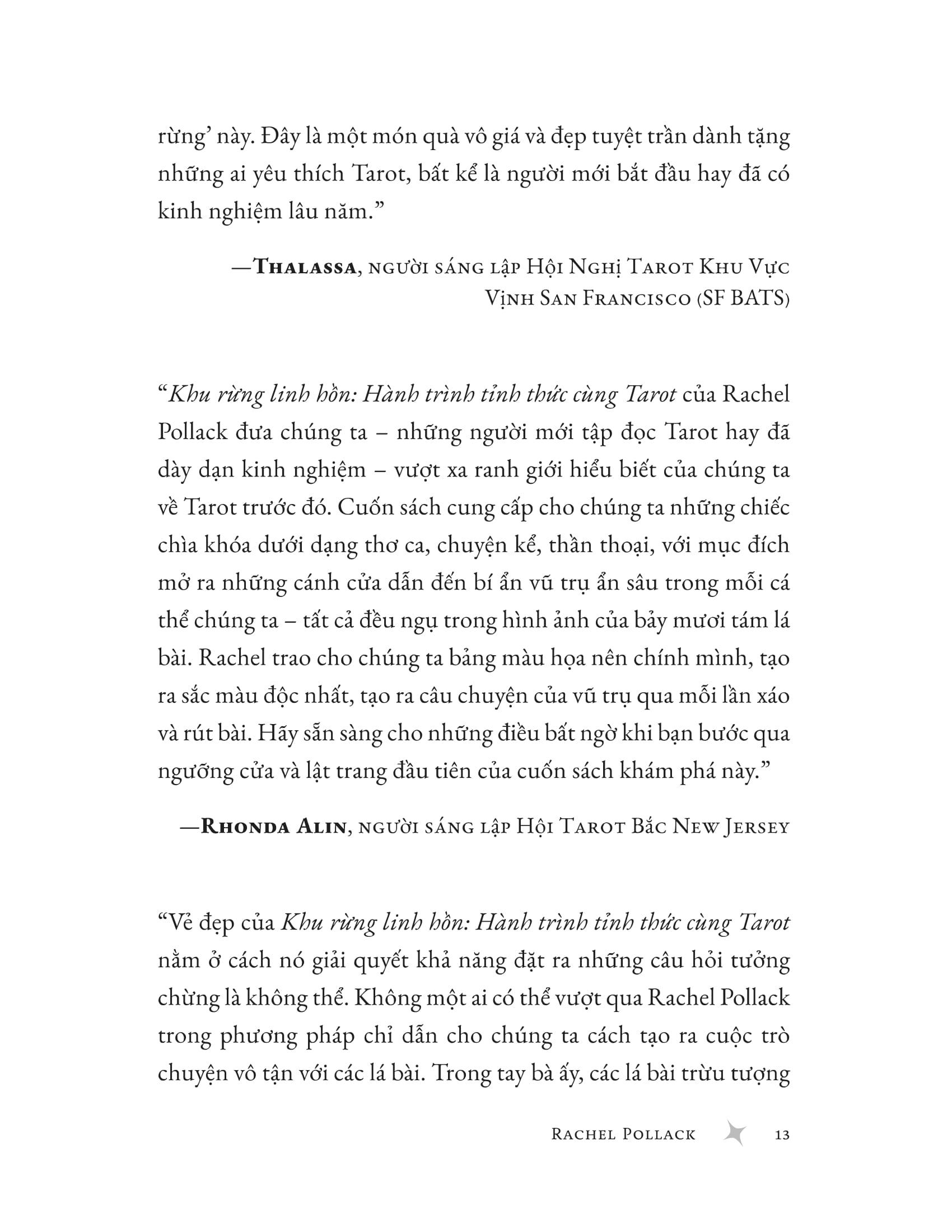 Mua tại Tiktokkhu rừng linh hồn - hành trình tỉnh thức cùng tarot dành cho những người tìm kiếm con đường tâm linh, khu rừng linh hồn: hành trình tỉnh thức cùng tarot mở ra một lối đi khác biệt với các sách dạy “cách đọc bài” thông thường. thay vì diễn giải từng lá bài, chuyên gia tarot rachel pollack mời bạn dạo bước trong khu rừng tarot, nơi mà bạn sẽ bắt gặp tất cả những biểu tượng cổ xưa, giải mã tiếng nói của chúng, và học cách kết nối với chiều sâu linh hồn m.ình. trong khu rừng này, bạn sẽ học được: