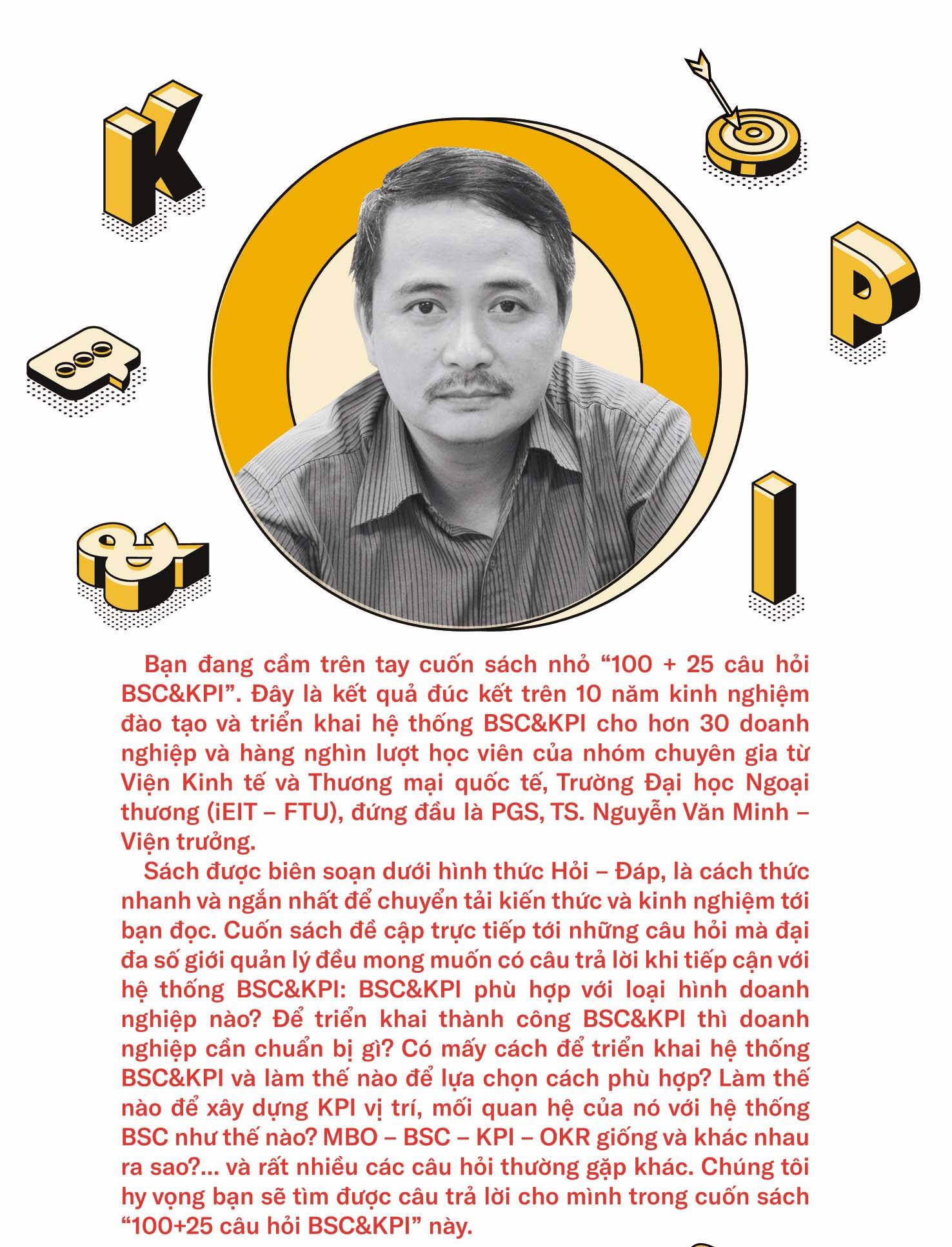 Cuốn sách “100+25 Câu hỏi BSC&KPI” là thành quả đúc kết trên 10 năm kinh nghiệm đào tạo và triển khai hệ thống BSC&KPI cho hơn 30 doanh nghiệp và hàng nghìn lượt học viên của nhóm chuyên gia từ Viện Đào tạo và Tư vấn doanh nghiệp - Trường Đại học Ngoại Thương (iEIT – FTU), đứng đầu là PGS.TS Nguyễn Văn Minh.