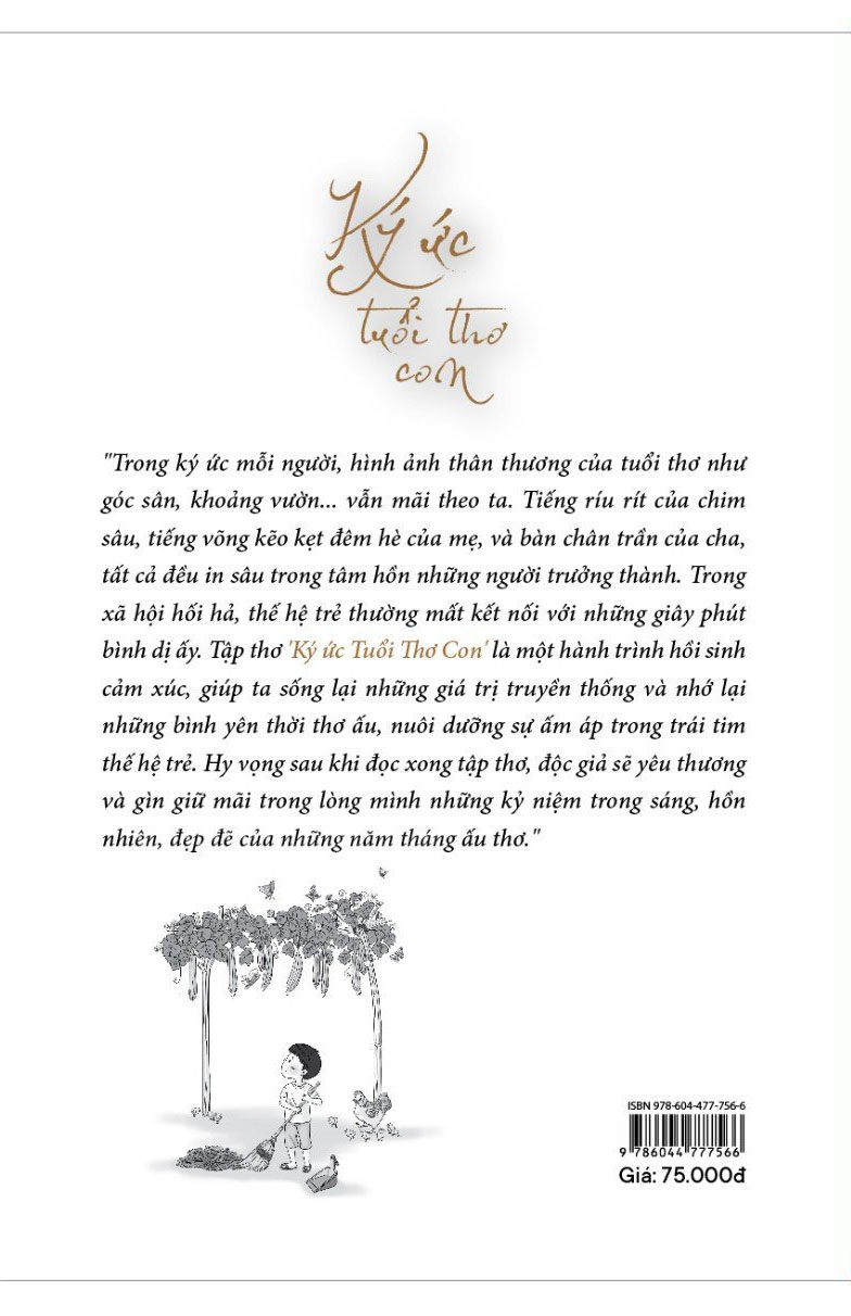Tập thơ “Ký ức tuổi thơ con” của tác giả Trần Thị Quyên là một hành trình hồi sinh cảm xúc, giúp ta sống lại tháng ngày bình yên thời thơ ấu, khơi dậy những ký ức ngủ quên. Cuốn sách sẽ đưa ta tìm về quãng thời gian trong trẻo, hồn nhiên với cánh đồng trổ lúa, với gói bánh chưng xanh và với xóm làng thân thương nghĩa tình. Độc giả sẽ yêu thương, gìn giữ kỷ niệm trong sáng, hồn nhiên, đẹp đẽ của những năm tháng ấu thơ.