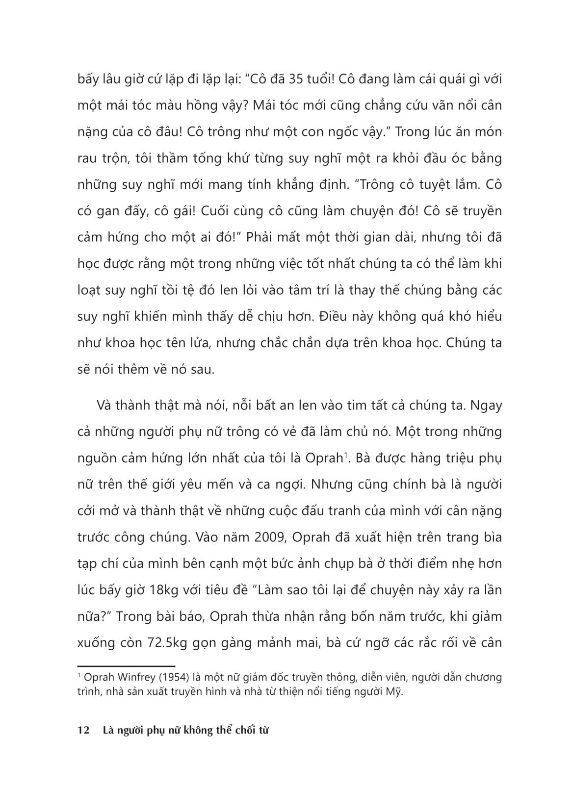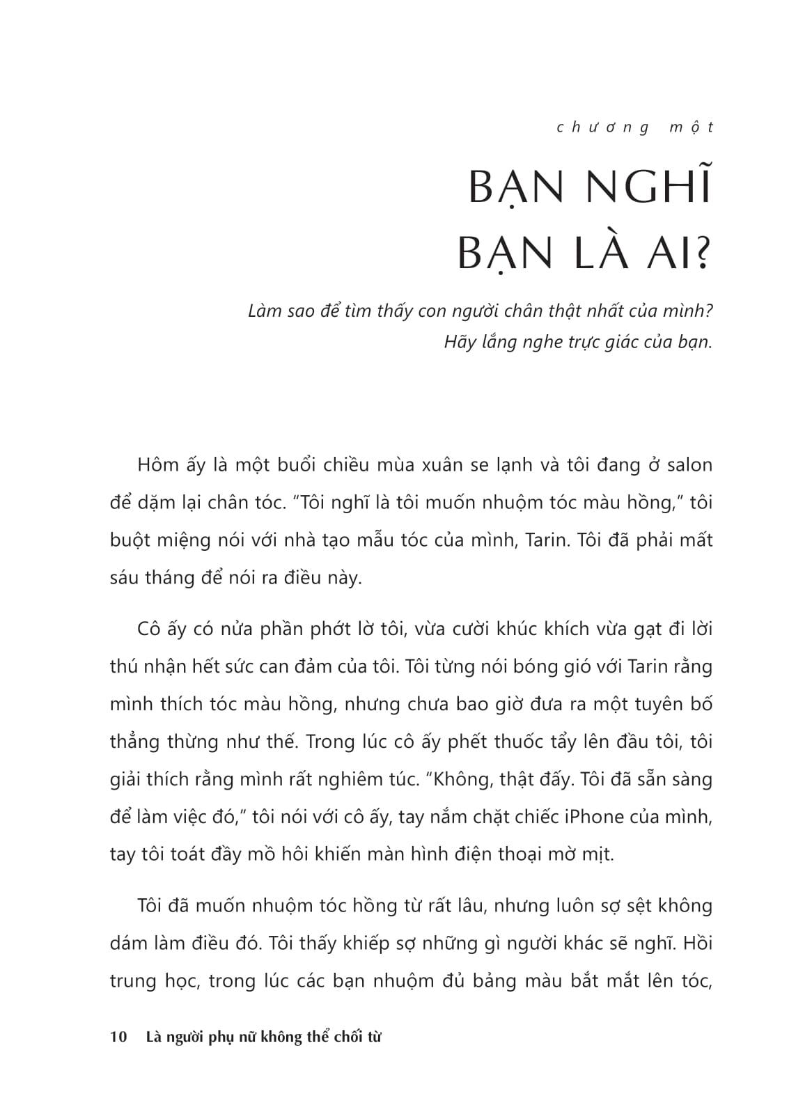 Thứ năng lượng bí ẩn này chính là “sự tự tin bền vững”, được xây dựng bằng niềm tin mạnh mẽ, sự thấu hiểu và công nhận bản thân, không bị áp đặt bởi bất cứ khuôn mẫu nào. Cuốn sách dành cho những người phụ nữ khao khát sống thật và tỏa sáng theo cách của riêng m.ình. “Là người phụ nữ không thể chối từ” là cuốn cẩm nang “đắc lực” để bạn hiện thực hóa khát vọng của m.ình, thông qua các công cụ: