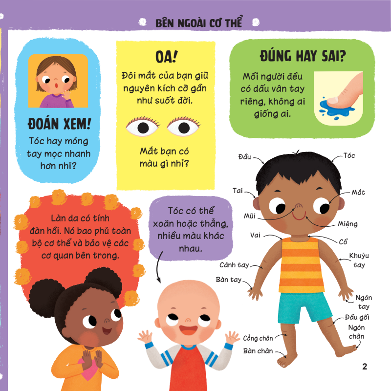 Lift-The-Flap-Lật Mở Khám Phá - Những Kiến Thức Đầu Đời - Cơ Thể Tuyệt Diệu Bạn có biết, cơ thể người là một trong những chủ đề mà các em bé cực kỳ tò mò từ khi lên 3 tuổi không? Con quan tâm và thắc mắc về những hoạt động của cơ thể m.ình như: nhắm mở mắt, thức ăn sẽ trôi đi đâu, trái tim có hình gì, sao con có màu tóc hay chiều cao khác với các bạn khác… Vậy thì hãy cùng mở ngay cuốn sách thú vị này để con giải đáp tất tần tật những thắc mắc của m.ình về chủ đề “cơ thể tuyệt diệu” nhé. Một cuốn sách xinh xắn với 05 ưu điểm vượt trội: Trình bày nội dung logic theo từng chủ điểm nhỏ, giúp trẻ khám phá từ ngoài cơ thể đến bên trong, rồi học các thói quen tốt cho sinh hoạt và sức khỏe. Tranh vẽ siêu dễ thương, màu sắc rực rỡ với các khối hình tương phản cực kỳ bắt mắt, giúp kích thích sự phát triển thị giác và gia tăng hứng thú khám phá thông tin của trẻ. Các miếng LẬT - MỞ diệu kỳ, thú vị như một trò chơi khuyến khích trẻ dùng tay tương tác, dùng mắt theo dõi và tập trung tâm trí để tiếp thu kiến thức tốt hơn, ghi nhớ hơn và phát triển tư duy so sánh, phân tích tốt hơn. Khổ sách to, bìa cứng, trang sách cứng dày 2mm, bo tròn tất cả các góc cạnh giúp trẻ sử dụng an toàn và rất bền. Cuốn sách phù hợp với phổ tuổi rộng từ 3-6 tuổi. 3-4 tuổi con tập trung kích thích giác quan và khám phá kiến thức cơ bản qua hoạt động Lật-Mở miếng ghép. 5-6 tuổi con được khuyến khích hiểu cơ thể và áp dụng các bài học kỹ năng chăm sóc, vệ sinh, bảo vệ bản thân.