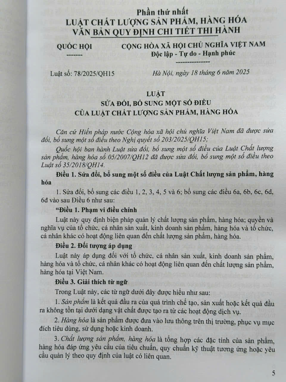 Ngày 18 tháng 6 năm 2025 tại kỳ họp thứ 9 Quốc hội khóa XV, Quốc hội nước Cộng hòa xã hội chủ nghĩa Việt Nam đã thông qua Luật số 78/2025/QH15 ngày 18 tháng 6 năm 2025 của Quốc hội ban hành Luật sửa đổi, bổ sung một số điều của Luật Chất lượng sản phẩm, hàng hóa số 05/2007/QH12 đã được sửa đổi, bổ sung một số điều theo Luật số 35/2018/QH14.