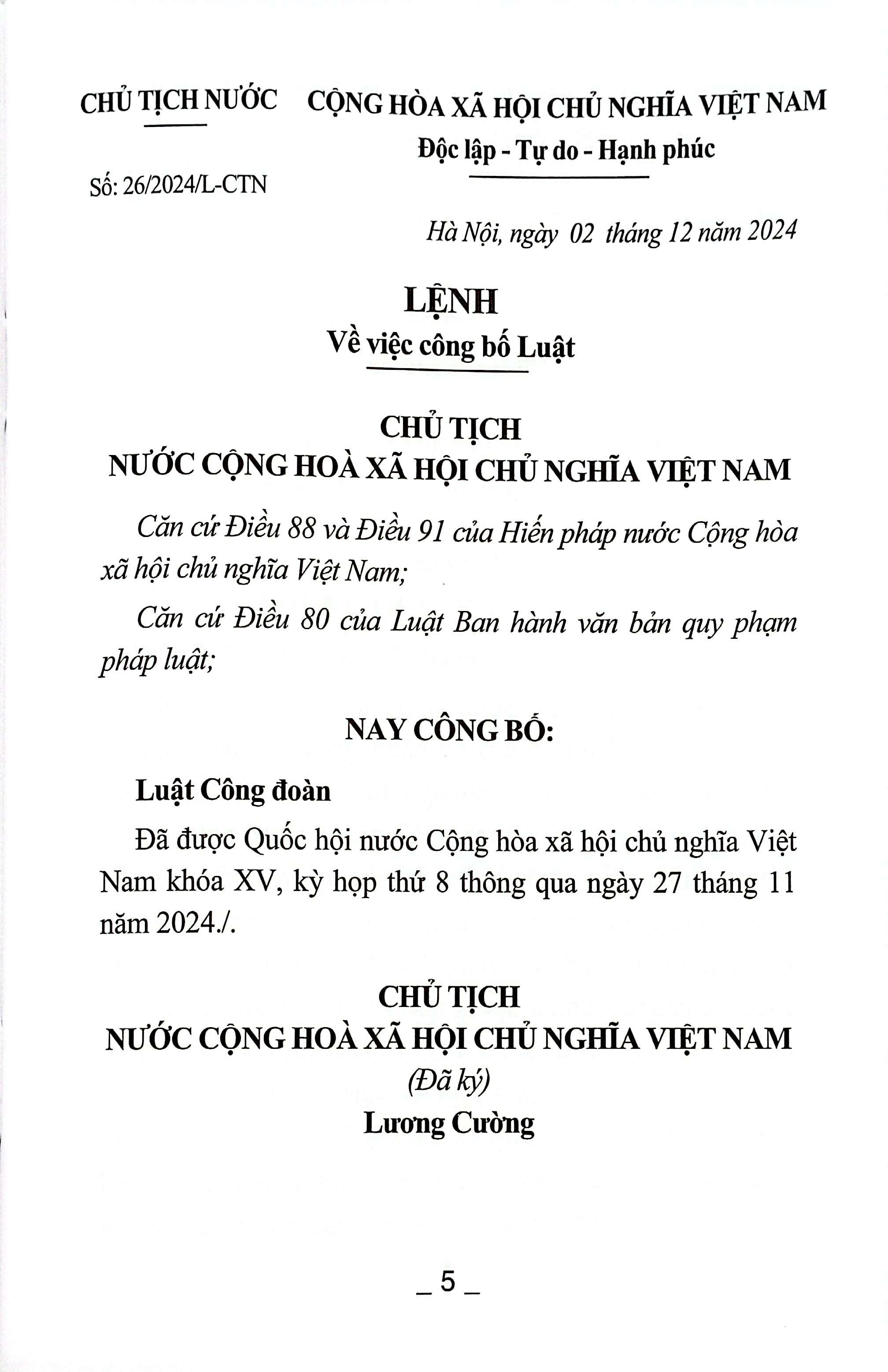 Luật Công Đoàn Luật số: 50/2024/QH15 ngày 27 tháng 11 năm 2024 Luật này quy định về chức năng, nhiệm vụ, quyền, trách nhiệm của Công đoàn Việt Nam; quyền thành lập, gia nhập và