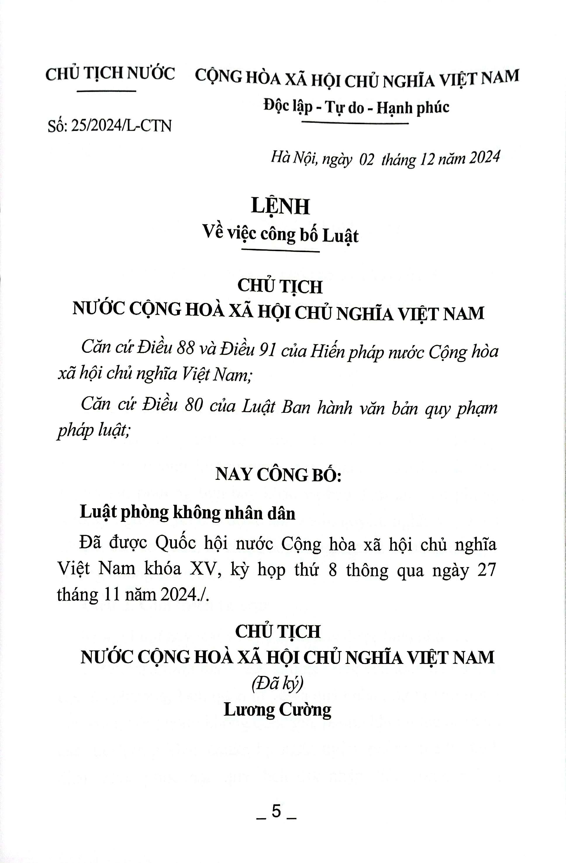 Luật Phòng Không Nhân Dân Luật số: 49/2024/QH15 ngày 27 tháng 11 năm 2024 Luật này quy định về nguyên tắc, nhiệm vụ, lực lượng, hoạt động phòng không nhân dân; quản lý tàu bay
