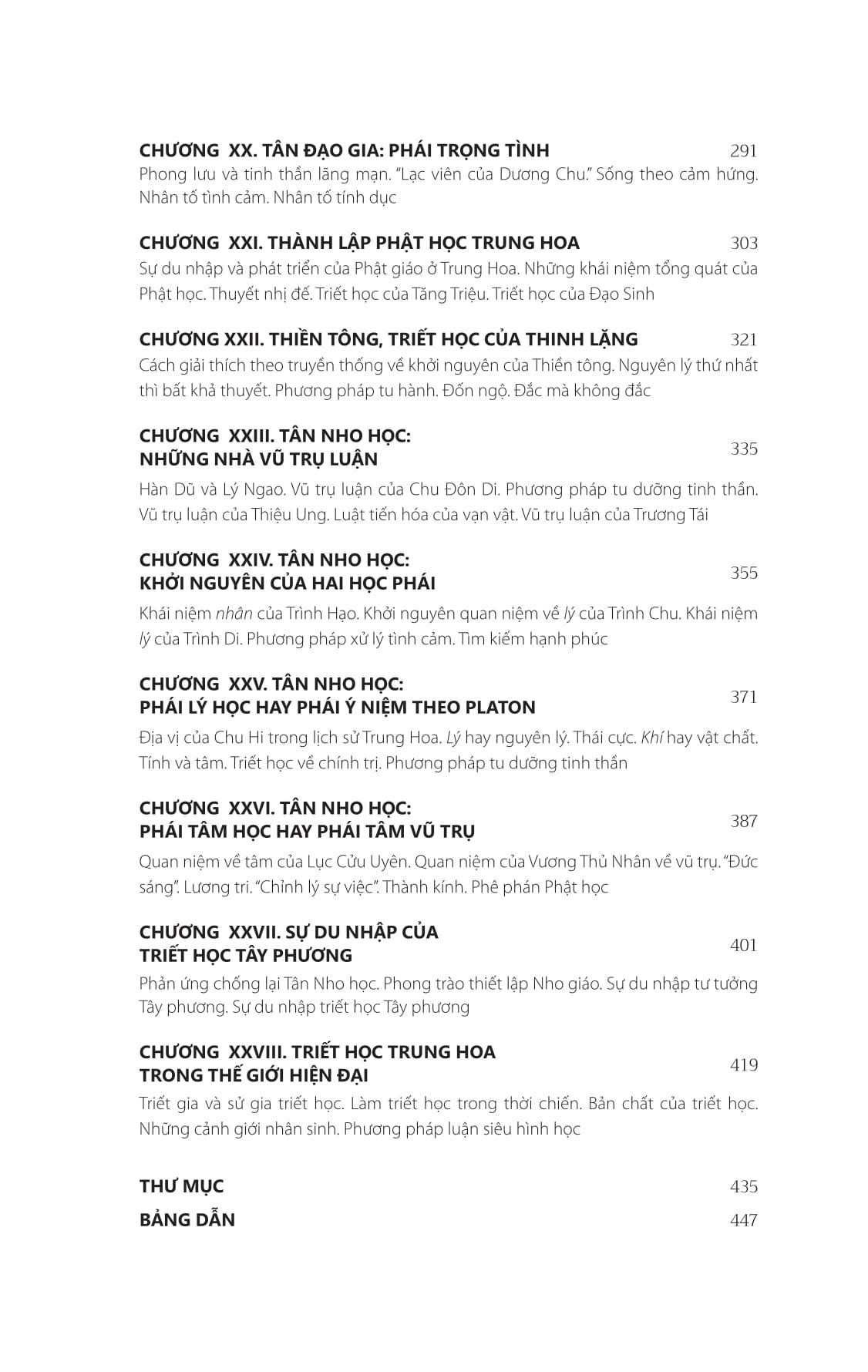 Cuốn sách làm sáng tỏ những trường phái triết học phổ biến nhất như Nho gia và Đạo gia; đồng thời giới thiệu với độc giả về Mặc gia, Âm Dương gia, Pháp gia, Tân Đạo gia, Tân Nho gia và sự du nhập của triết học Tây phương.