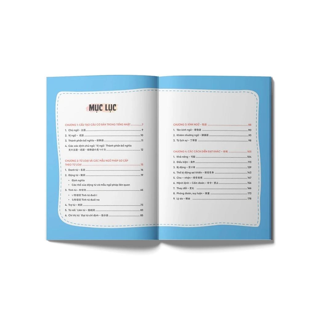 Cuốn sách tổng hợp một cách hệ thống các ngữ pháp sơ cấp giúp người học dễ dàng nắm bắt và được cung cấp đầy đủ về ý nghĩa, cách chia cùng với ví dụ minh họa sinh động. Việc hệ thống các mẫu ngữ pháp dưới dạng sơ đồ tư duy – mindmap giúp người học dễ nhớ cũng như vận dụng vào các bài tập luyện tập hay như kỳ thi JLPT.