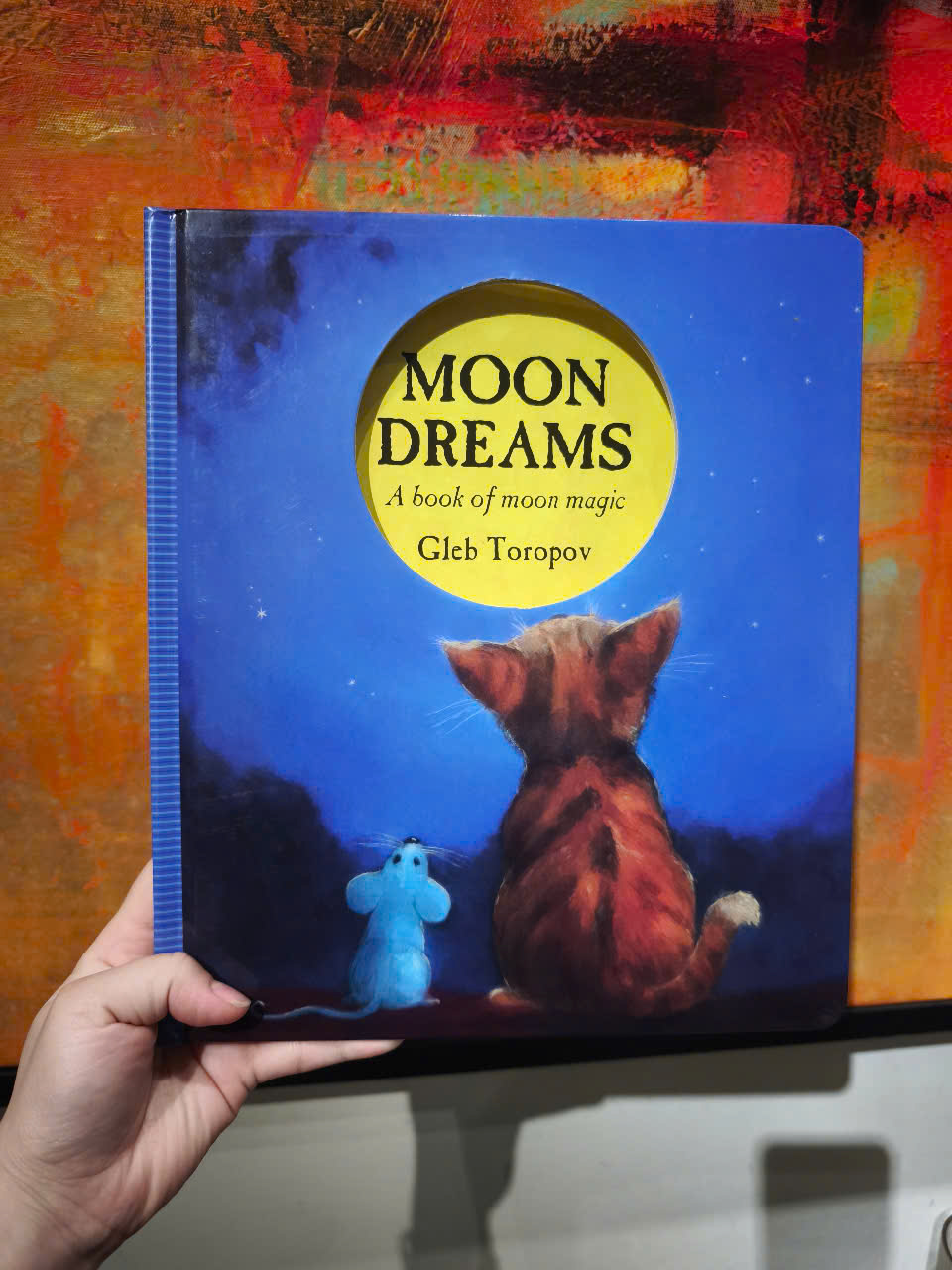 The moon holds secrets for animals as well as for children. A fish looking at a crescent moon through the ripples of a stream thinks it is a writhing caterpillar. To butterflies, a crescent moon looks like a delicious banana. To mice, a half moon looks like cheese... In this picture book, with lines cut through it, the moon takes on many shapes, growing larger and larger until it shines full upon a little boy.