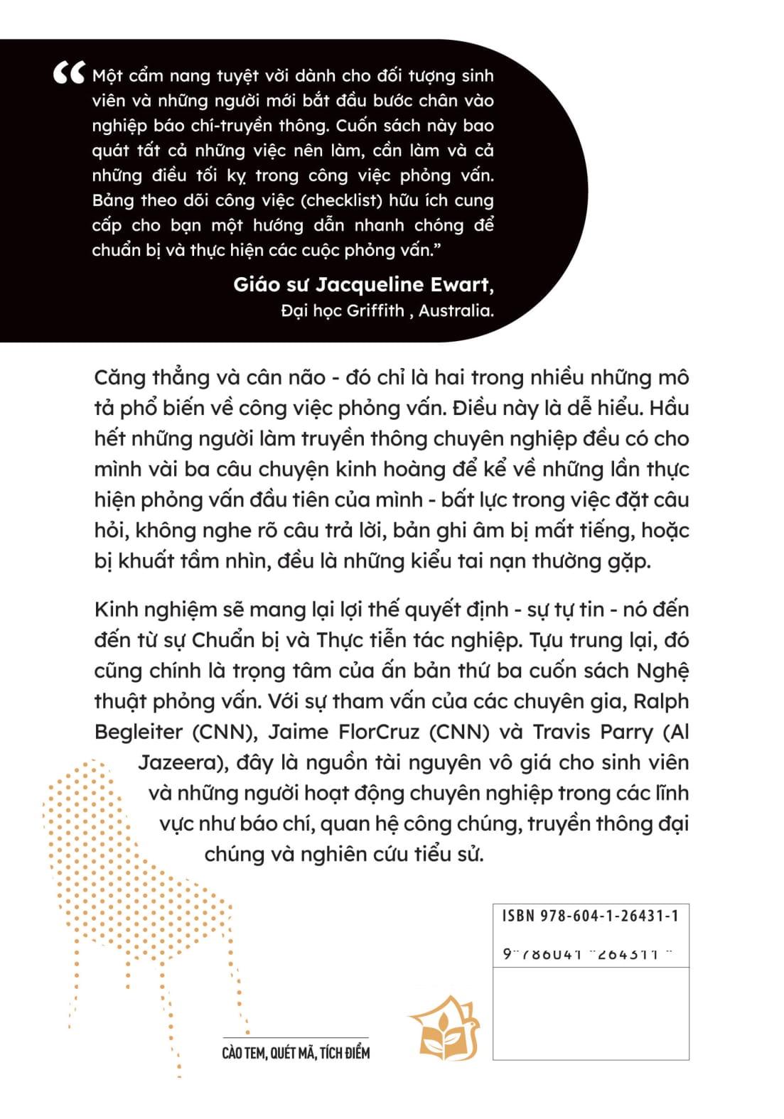 Đây thực sự là một bộ công cụ đầy đủ cho học viên và nhà báo chuyên nghiệp trau dồi các kỹ năng cần thiết để trở nên sắc sảo trong các cuộc phỏng vấn; một nguồn tài liệu lý tưởng và quan trọng cho những người đang học tập, nghiên cứu hoặc đang hoạt động trong lĩnh vực báo chí và PR, viết, sản xuất nội dung chuyên nghiệp,…