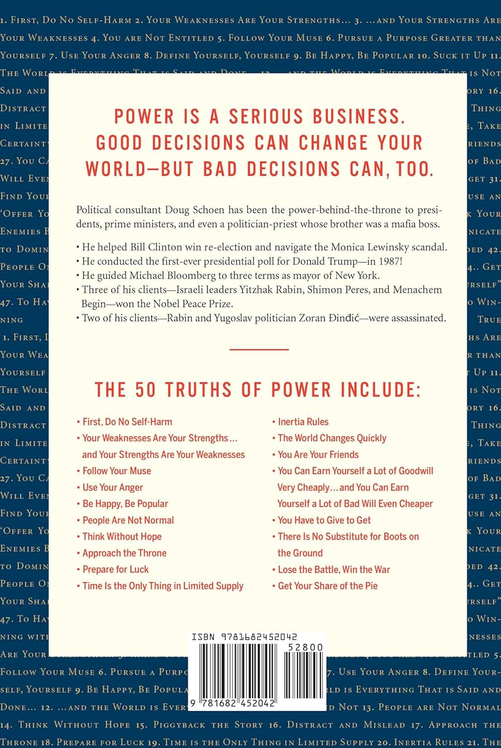 Political consultant Doug Schoen has been the power-behind-the-throne to Presidents, Prime Ministers and even a politician-priest whose brother was a mafia boss. He helped Bill Clinton win re-election and navigate the Monica Lewinsky scandal. He conducted the first-ever presidential poll for Donald Trump - in 1987! He guided Michael Bloomberg to three terms as Mayor of New York. Three of his clients - Israeli leaders Yitzhak Rabin, Shimon Peres and Menachem Begin - won the Nobel Peace Prize. But two - Rabin and Yugoslav politician Zoran Djindjic - were assassinated. Here Schoen reveals the 50 truths of power he has learned in his prestigious career as a “Political Insider,” the title of his long-running Fox-TV show. It is a book for grown-ups. Power is a serious business. Good decisions can change your world - but bad decisions can too.