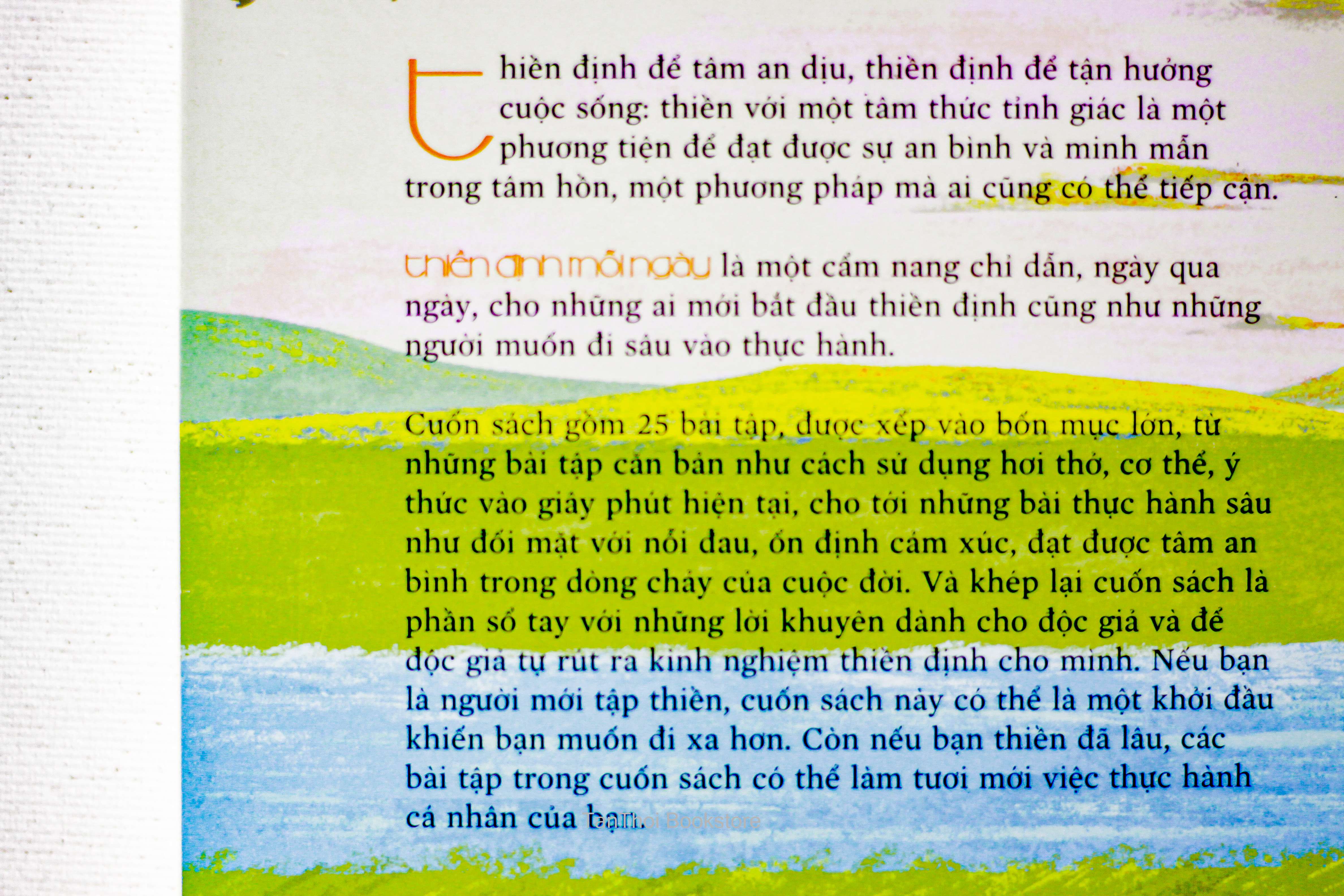 Thiền định mỗi ngày cùng tác giả với cuốn 3 phút thiền đã được Nhã Nam phát hành. Khác với 3 phút thiền tập trung vào các bài tập nhỏ và ngắn gọn, cuốn sách này đi sâu hơn vào các khái niệm, phạm trù trong thiền định như lý nhân duyên, tính Không, lẽ vô thường, lòng từ, tâm bi mẫn, Tuy nói về những lý thuyết và phạm trù trừu tượng dường như khó hiểu, cuốn sách có lối viết nhẹ nhàng, tự nhiên, dẫn dắt độc giả từ chương này qua chương khác mà không khiến ta cảm thấy khó hiểu hay quá tải với lượng thông tin ấy. Bởi vậy dù độc giả là người mới tập thiền hay thực hành thiền đã lâu, cuốn sách đều sẽ mang lại những trải nghiệm nhẹ nhàng và tuyệt diệu.