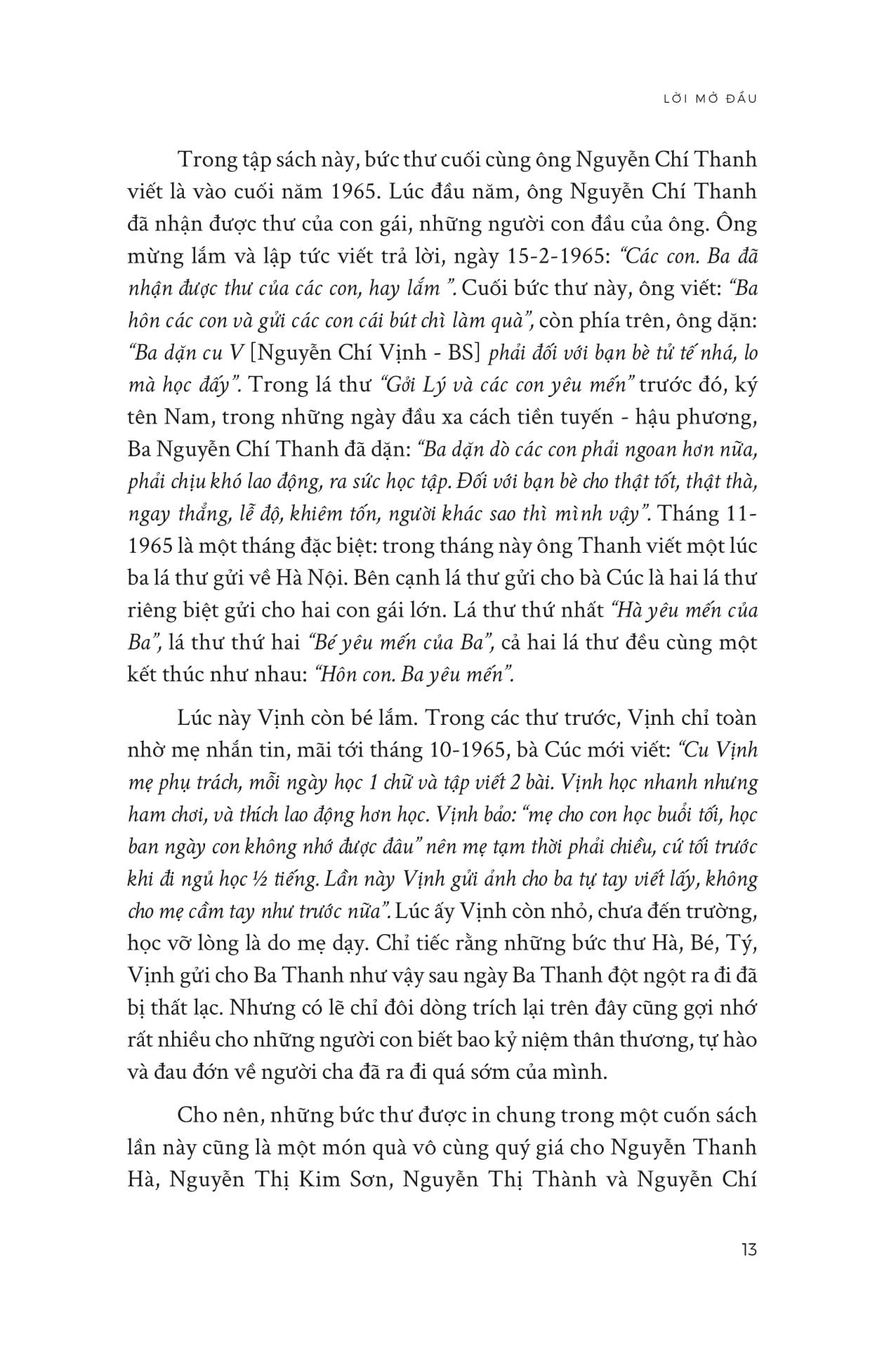 - Những cánh thư ra Bắc vào Nam TRÍCH ĐOẠN/ CÂU QUOTE HAY “Những lá thư này là một di sản Ba Thanh để lại, dành riêng cho con cháu, để họ truyền lại cho mãi mãi những lứa cháu con sau này… như những giọt sữa nuôi dưỡng trong cả cuộc đời, như những dòng máu tiếp tục chảy trong huyết quản” (Trích Lời mở đầu) “Không được thơ Cúc, anh phần thì trông mong, phần thì áy náy, không biết m.ình ăn ở với vợ con thế nào mà đến khi xa nhau phải thế. Em cũng biết tuy nhớ nhau nhiều ngày hay sinh ra nghĩ thế này thế khác, tâm lý ấy cũng có gì là lạ.” (Trích thư Đại tướng Nguyễn Chí Thanh gửi vợ Nguyễn Thị Cúc, ngày 5-7-1950) “Ba dặn các con đây này: Phải gắng học cho giỏi, tính nết cho tốt, làm việc cho khá. Ba chúc các con ngoan để sau này thành người có đạo đức.” (Trích thư Đại tướng Nguyễn Chí Thanh gửi gia đình, tháng 11-1964) “… Đại tướng Nguyễn Chí Thanh vẫn luôn hiện hữu trong cuộc đời chúng ta. Trong các văn kiện, tài liệu của Đảng và Nhà nước. Trong những bộ sách. Trong những cuốn phim. Qua các kỷ vật trong viện bảo tàng. Qua rất nhiều bài viết trên báo chí. Qua truyền hình và đài phát thanh. Với những bức tượng ở quảng trường, trong các khu lưu niệm. Với những miếu thờ giản dị nơi thôn dã...” (Trích Tòng Bạt) “Chúng ta đã đọc những bài báo của Đại tướng với bút danh “Trường Sơn” - những bài viết làm nức lòng dân tộc trong những năm đánh Mỹ. Chúng ta quen với một giọng văn đanh thép, sắc sảo, hào hùng, một tư duy sáng suốt đầy sức thuyết phục, một thái độ tận tụy, kiên trung quyết tâm chiến đấu và sẵn sàng hy sinh. Chúng ta cũng biết đến những bài nói sảng khoái, chân tình khi vị tướng nông dân lội bùn trên những cánh đồng hợp tác, điểm xuyết những câu hò man mác những triền sông. Chúng ta cũng đã đọc những câu chuyện phảng phất màu sắc huyền thoại nhưng lại rất thực, kể về một cán bộ lãnh đạo cao cấp cõng cấp dưới qua suối, hay một chỉ huy quân đội “bênh vực” một làn điệu quan họ. Bây giờ, đọc lại những bức thư viết từ khoảng xa là 69, gần là 49 năm trước, ta gặp lại vẫn Nguyễn Chí Thanh ấy, nhưng trong nỗi chờ mong thư vợ, mong đến mức tỷ mẩn đếm từng lá thư, băn khoăn đến mức so sánh số thư gửi đi với số thư nhận được, rồi nghĩ ra đủ thứ lý do để mà lo lắng, băn khoăn, nào là ốm đau, nào là giận hờn, nào là bom lửa… Ta thấy vị Đại tướng ngày nào sao mà gần gũi, sao mà thân thương, trong những khía cạnh hết sức đời thường. Giống như tôi, giống như bạn. Những lá thư trở nên tư liệu lịch sử đầy tính nhân văn.” … “Đọc mỗi lá thư như dò tìm trở lại từng bước chân trên cả con đường của một con người, một gia đình, những khắc khoải cách xa, những lo âu trĩu nặng, những dặn dò ân cần, những niềm vui, những khao khát trong lòng người chồng, người cha đang gánh vác biết bao nhiệm vụ nặng nề.” (Trích Lời mở đầu)