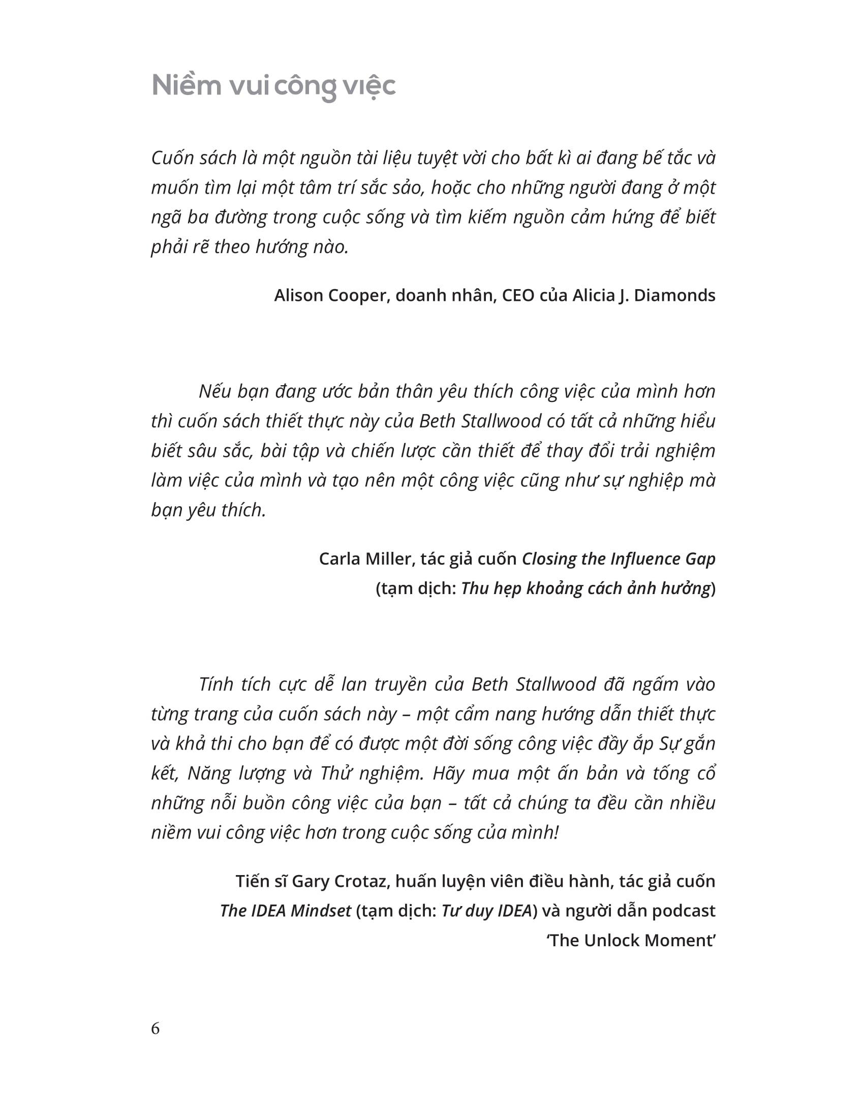 - "Niềm vui công việc" - Một bộ công cụ thực tế bạn có thể áp dụng Cuốn sách "Niềm vui công việc" là một bộ sưu tập các công cụ thực tế đã được thử nghiệm và kiểm tra mà tác giả Beth Stallwood đã thu thập qua nhiều năm làm việc với những con người đang cảm thấy chán chường và chán nản trong công việc. Cuốn sách được thiết kế để đưa bạn vào một chuyến thám hiểm nhằm tìm kiếm và duy trì nhiều niềm vui trong đời sống công sở của bạn.