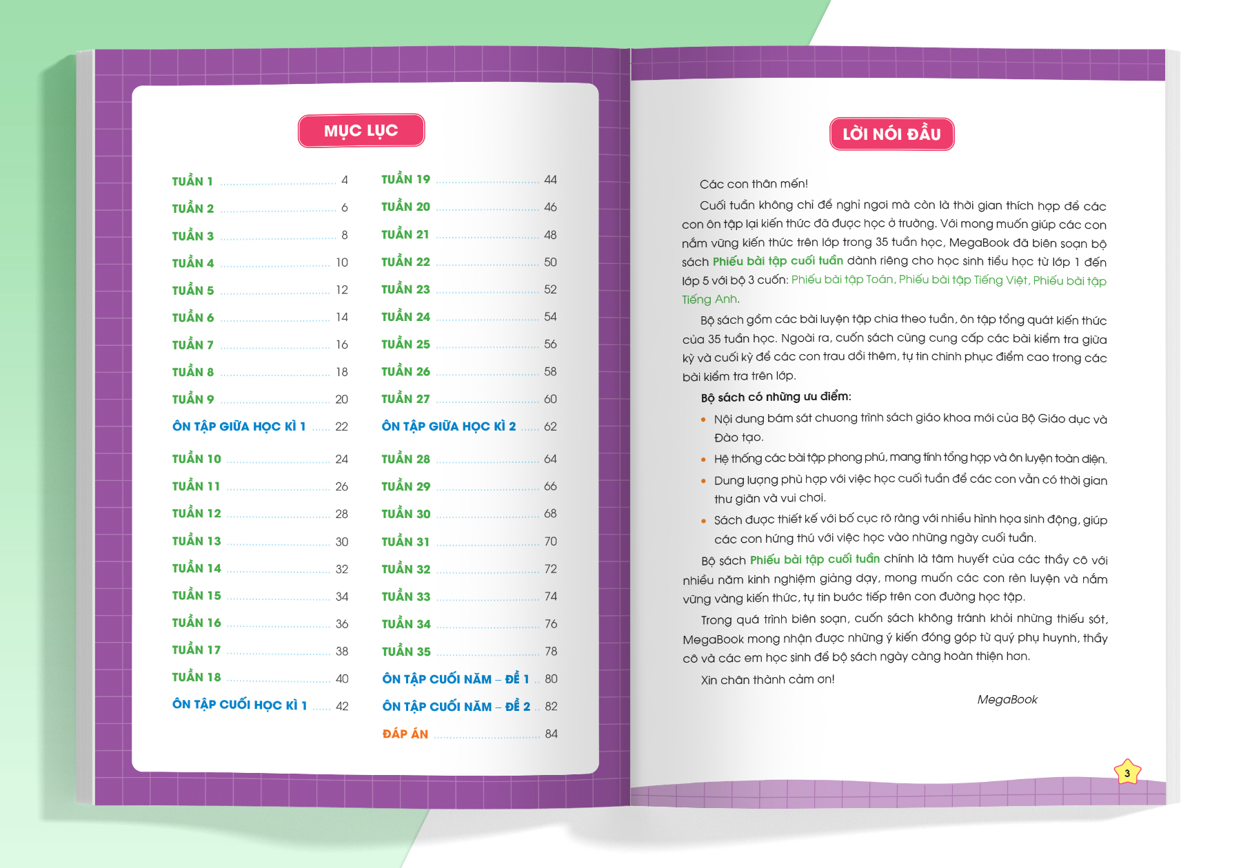 Bộ sách gồm các bài luyện tập chia theo tuần, ôn tập tổng quát kiến thức của 35 tuần học. Ngoài ra, cuốn sách cũng cung cấp các bài kiểm tra giữa kỳ và cuối kỳ để các con trau dồi thêm, tự tin chinh phục điểm cao trong các bài kiểm tra trên lớp.