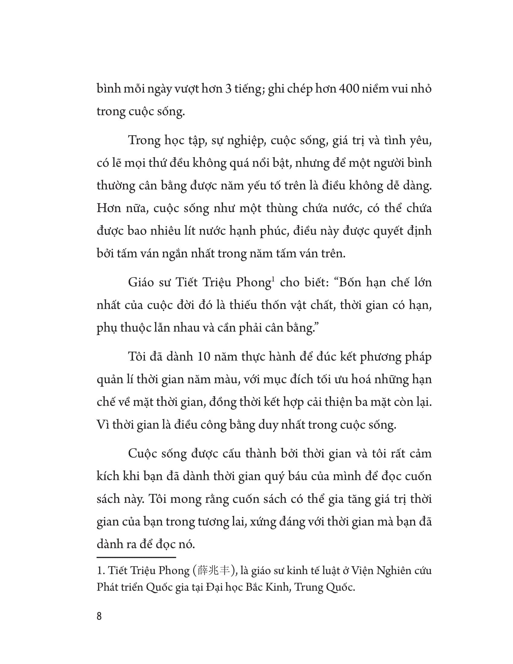 - Quản lí thời gian, đúng, nhưng theo cách độc đáo hơn! Trong học tập, sự nghiệp, cuộc sống, giá trị và tình yêu, có lẽ mọi thứ đều không quá nổi bật, nhưng để một người bình thường cân bằng được năm yếu tố trên là điều không dễ dàng. Hơn nữa, cuộc sống như một thùng chứa nước, có thể chứa được bao nhiêu lít nước hạnh phúc, điều này được quyết định bởi tấm ván ngắn nhất trong năm tấm ván mà bạn sẽ khám phá trong cuốn sách này. Khác với những phương pháp quản lí thời gian trước đó,quản lí thời gian theo năm màulà một phương pháp đầy màu sắc, có thể khiến bạn say mê và thích thú. Thông qua việc phân bổ và thống kê quản lí thời gian theo năm màu, đó là: màu xanh dương học tập, màu đỏ sự nghiệp, màu xanh lá cuộc sống, màu trắng giá trị và màu vàng tình yêu sẽgiúp bạn tận dụng thời gian một cách có chủ đích. Đồng thờikết nối con người bên trong với thế giới bên ngoài, khai thác năng lượng của bản thân, cảm nhận sự phong phú của cuộc sống và kiểm soát được thời gian mỗi ngày.