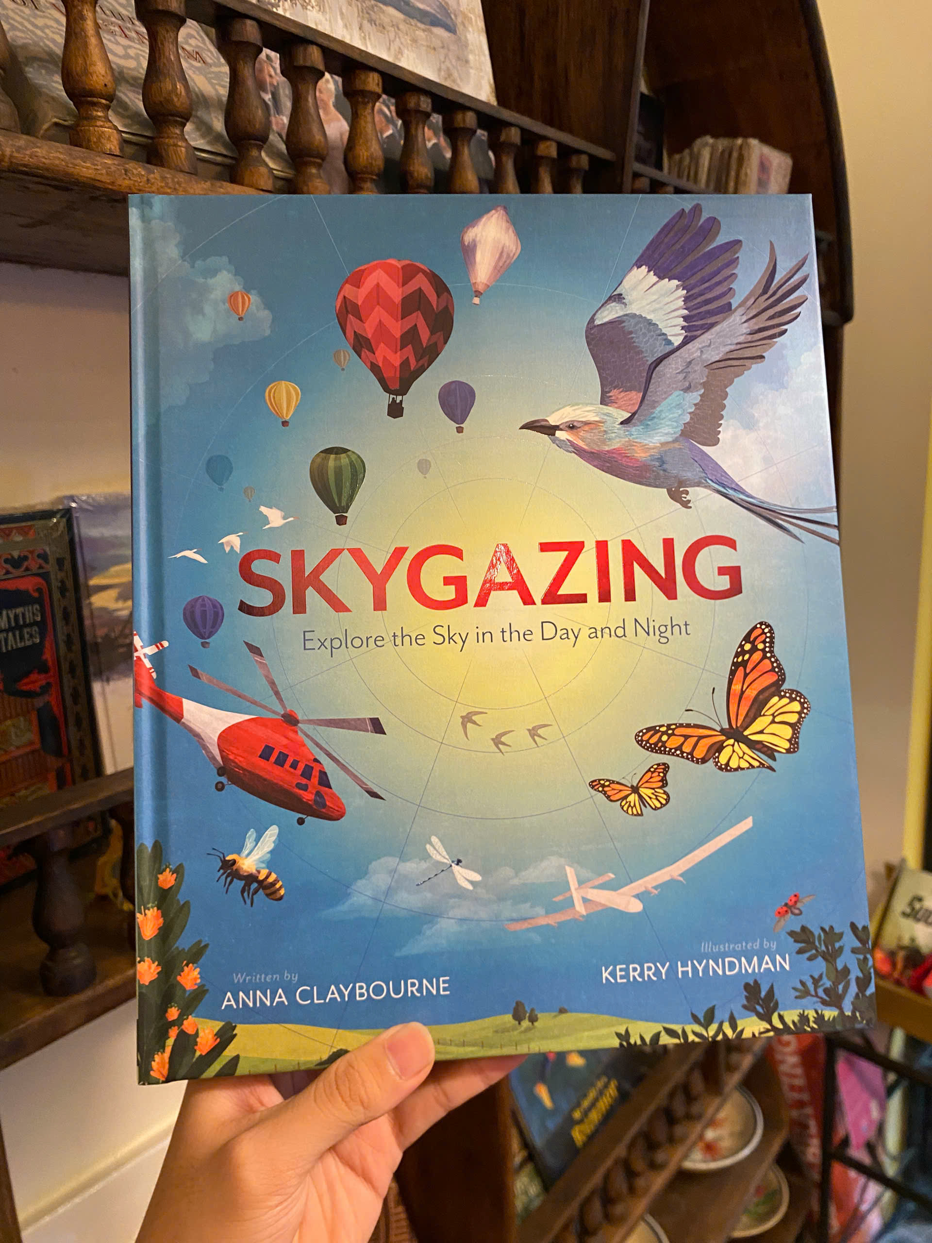Bạn thấy gì khi nhìn lên bầu trời? Bầu trời trông có vẻ rộng lớn, trống rỗng, nhưng thực ra nó bận rộn hơn bạn nghĩ. Từ mây trời, sao trời, chim chóc, máy bay và muôn vàn thứ khác – cả một bầu trời rộng lớn để khám phá. Skygazing là một cuốn sách hai mặt chứa đầy những thông tin liên môn đáng kinh ngạc, các hoạt động thú vị và những hình ảnh minh họa tuyệt đẹp để thưởng thức. Khám phá lý do tại sao bầu trời xanh, những thí nghiệm đầu tiên trên máy bay và cách trực thăng bay trên không, trước khi lật sách để tìm hiểu tất cả về bầu trời đêm. Tìm hiểu cách đọc các vì sao, phát hiện các sinh vật bay về đêm và chiêm ngưỡng màu sắc của cực quang.