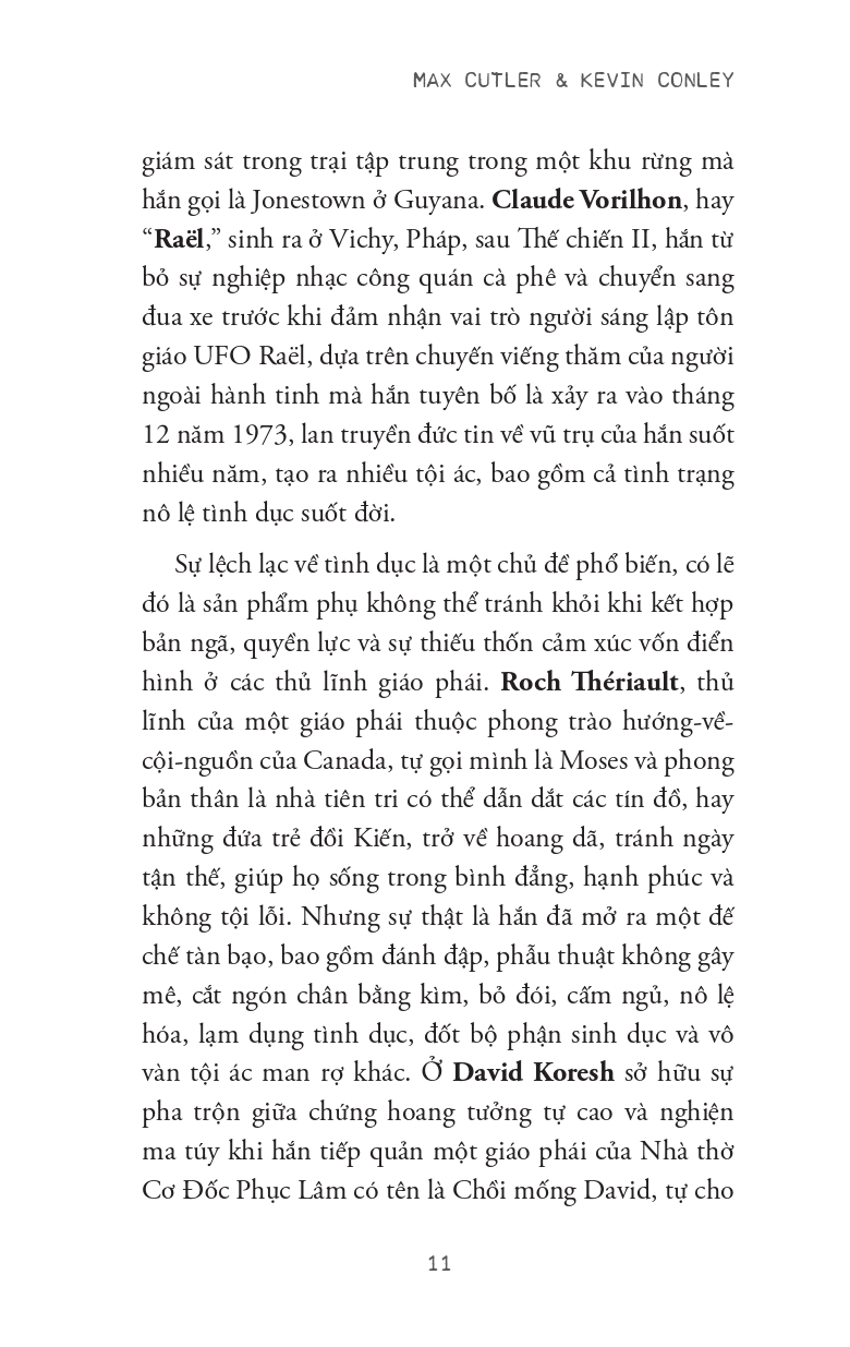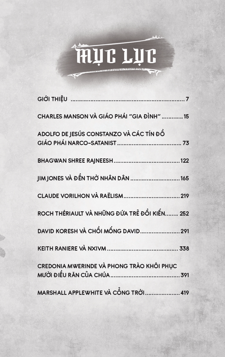 Cuốn sách được xây dựng dựa trên loạt podcast nổi tiếng Cults của Parcast – một trong những podcast dẫn đầu về đề tài giáo phái và tội phạm tâm lý học. Dưới góc nhìn cận tâm lý học và kể chuyện điều tra, Max Cutler và Kevin Conley tái hiện từng chi tiết trong cuộc đời và hành vi của các nhân vật như Charles Manson, Jim Jones, Keith Raniere, David Koresh,… những cái tên khiến cả thế giới rúng động bởi sự tàn nhẫn và khát vọng quyền lực không giới hạn.