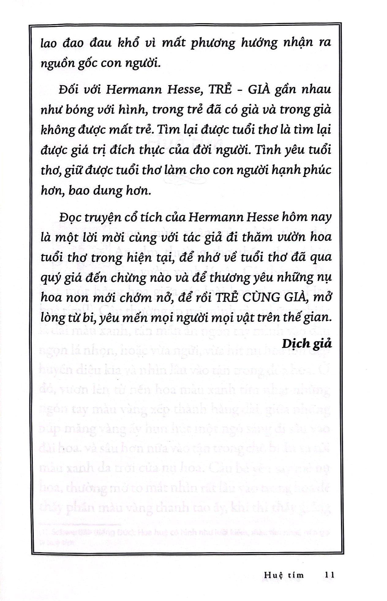 Đọc truyện cổ tích của Hermann Hesse hôm nay là một lời mời cùng với tác giả đi thăm vườn hoa tuổi thơ trong hiện tại, để nhớ về tuổi thơ đã qua quý giá đến chừng nào và để thương yêu những nụ hoa non mới chớm nở, để rồi TRẺ CÙNG GIÀ, mở lòng từ bi, yêu mến mọi người mọi vật trên thế gian.” - Dịch giả Thái Kim Lan