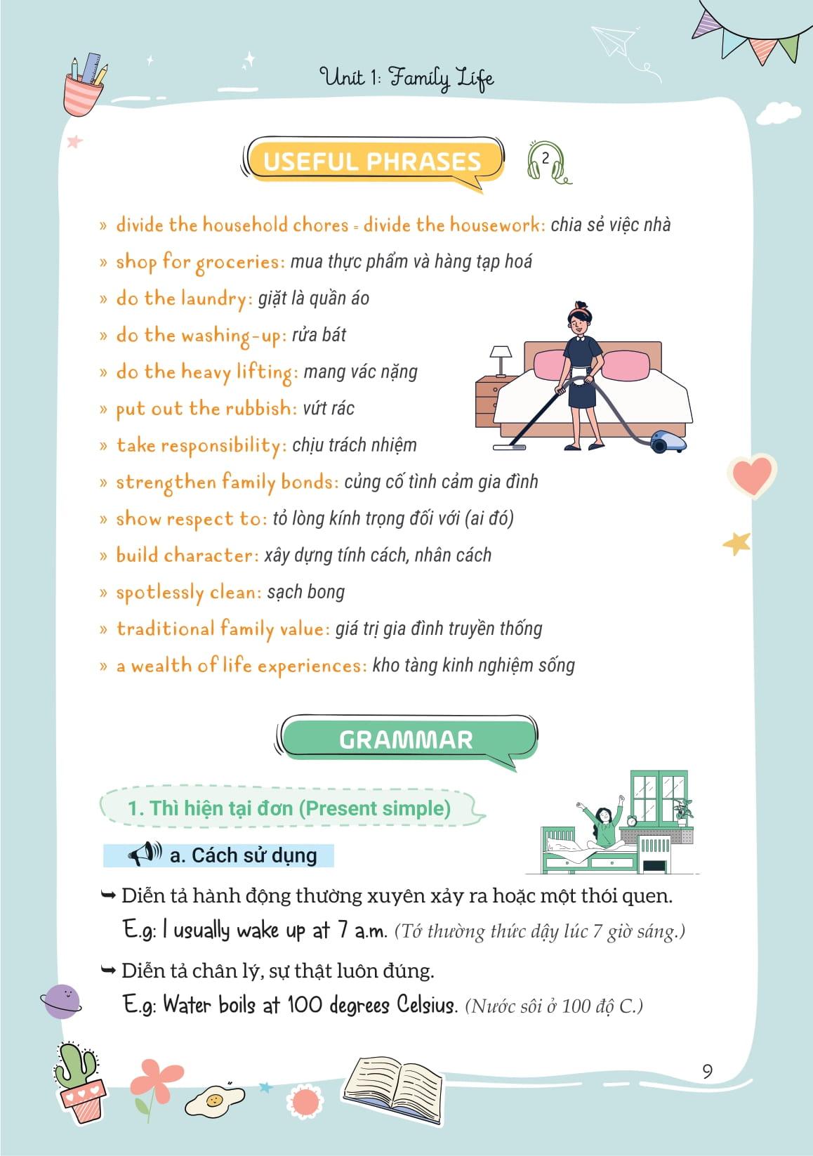 Useful Phrases – Cung cấp các cụm từ, mẫu câu thường gặp trong giao tiếp và bài thi, giúp học sinh ứng dụng linh hoạt trong thực tế.