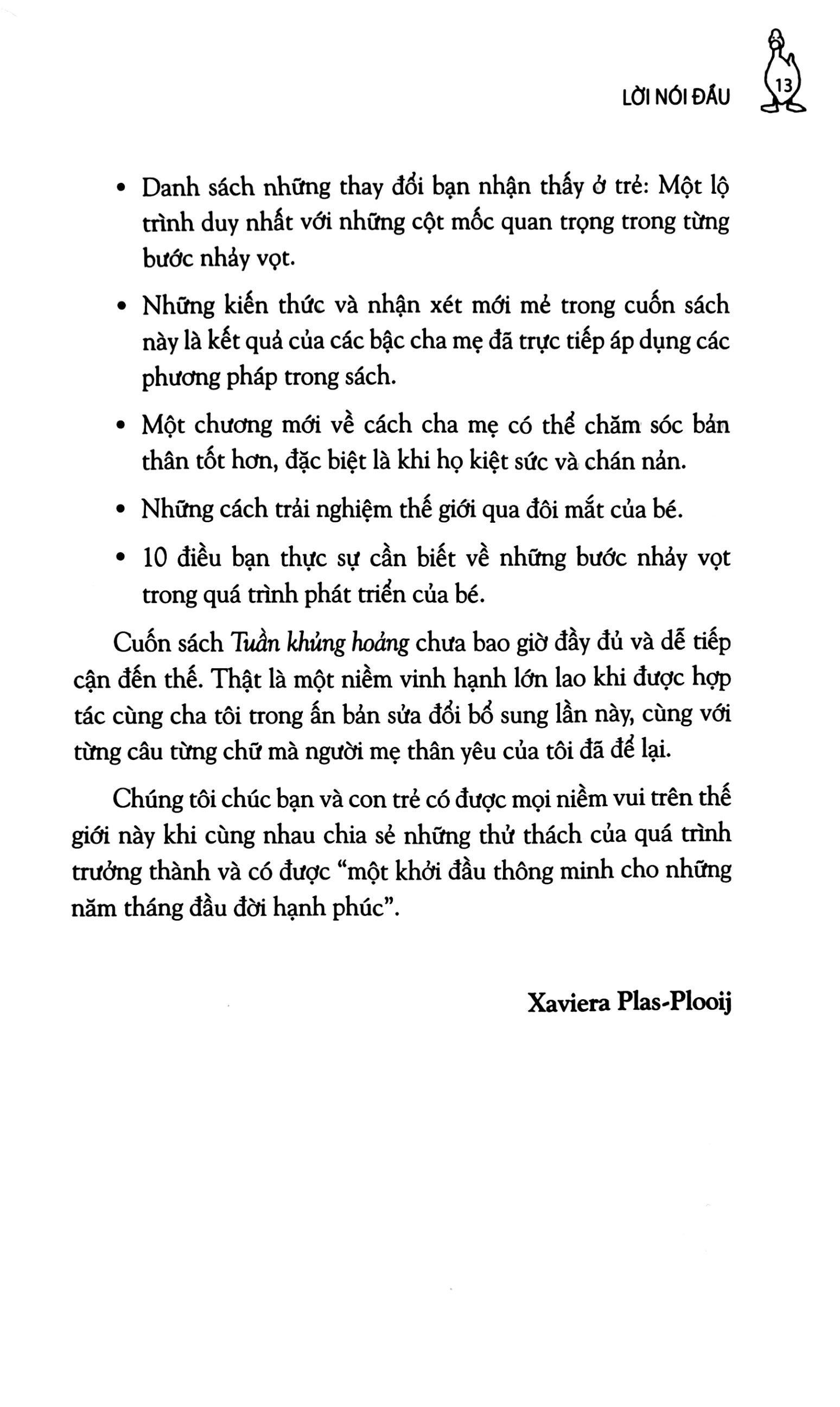 Các bậc phụ huynh hãy đọc sách để hiểu những cơ sở khoa học của tuần khủng hoảng, cũng như sự kỳ diệu của nó; để hiểu và thông cảm cho con khi con trải qua thời kỳ tập trung phát triển kỹ năng và tinh thần từ bên trong nên quên hết cả ăn và ngủ; để nhận biết khi các con học cách hóng chuyện, học lẫy, học bò, học ngồi hoặc học đi.