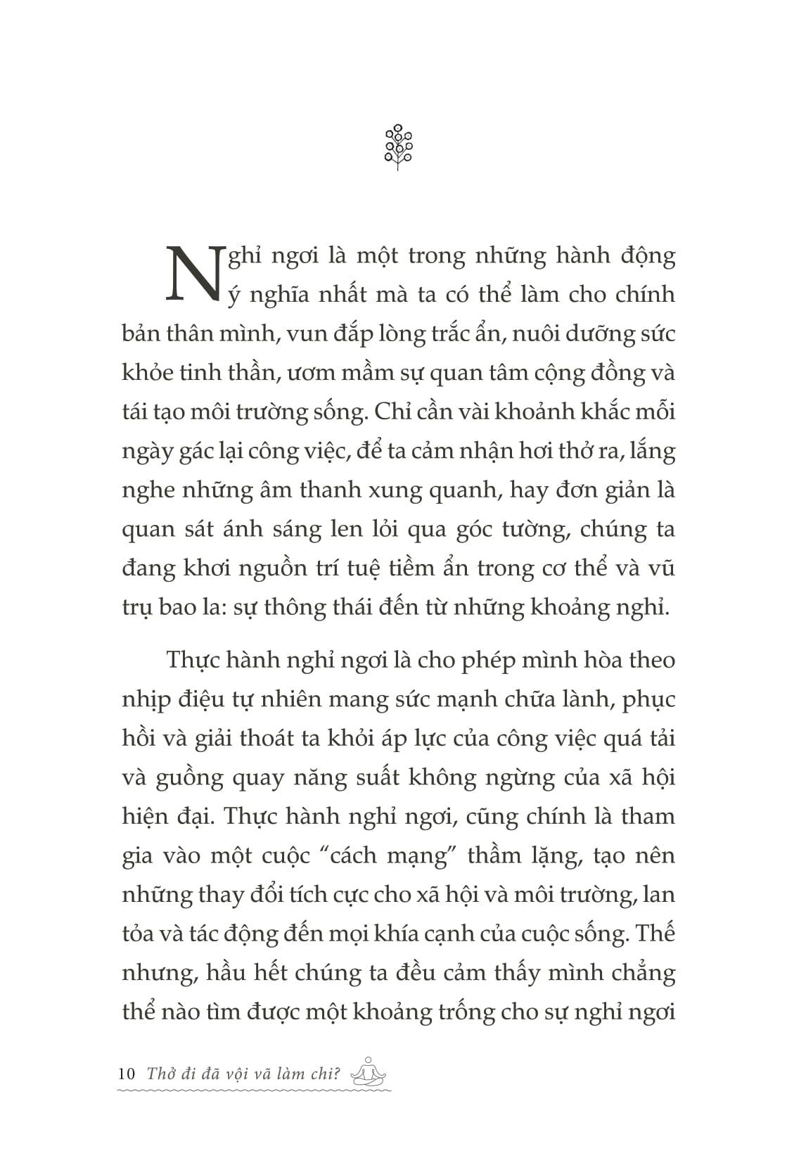 Mua tại TiktokThở Đi Đã - Vội Vã Làm Chi “Thở Đi Đã, Vội Vã Làm Chi” là cuốn sách chữa lành dành cho những ai đang bị cuốn vào vòng xoáy của nhịp sống hiện đại. Với lời văn nhẹ nhàng, tinh tế và sâu sắc, cuốn sách nhắc nhở chúng ta về một điều tưởng chừng rất đơn giản nhưng lại dễ bị lãng quên: hít một hơi thở chậm, và sống thật sự với hiện tại. Không giáo điều, không hô hào, sách như một người bạn thủ thỉ bên tai, khơi gợi cảm giác bình yên từ những điều nhỏ bé quanh m.ình. Nội dung chính của cuốn sách Cuốn sách gồm nhiều đoạn tản văn ngắn, mỗi chương là một lời nhắc nhở dịu dàng để ta quay về với chính m.ình. Nội dung tập trung vào các chủ đề:
