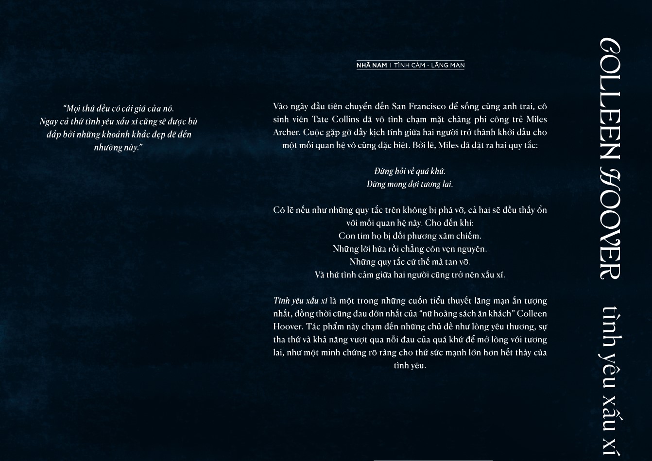 Tình yêu xấu xí là một trong những cuốn tiểu thuyết lãng mạn ẩn tượng nhất, đồng thời cũng đau đờn nhất của "nữ hoàng sách ăn khách" Colleen Hoover. Tác phẩm này chạm đến những chủ đề như lòng yêu thương, sự tha thứ và khả năng vượt qua nỗi đau của quá khứ để mở lòng với tương - lai, như một minh chứng rõ râng cho thứ sức mạnh lớn hơn hết thảy của tinh yeu.