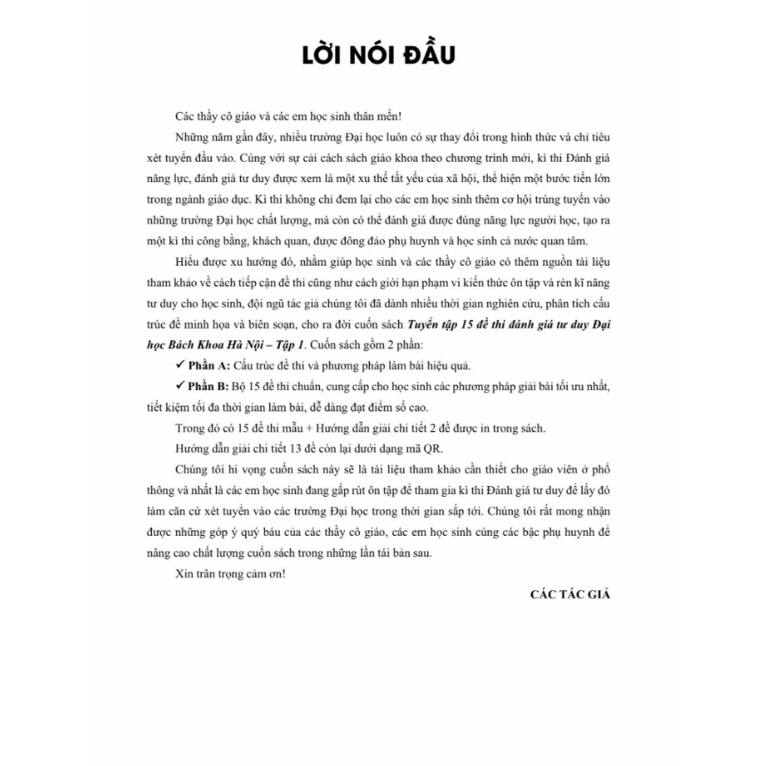 Tuyển tập 15 đề thi đánh giá tư duy Đại học Bách Khoa Hà Nội – Tập 1. Cuốn sách gồm 2 phần: