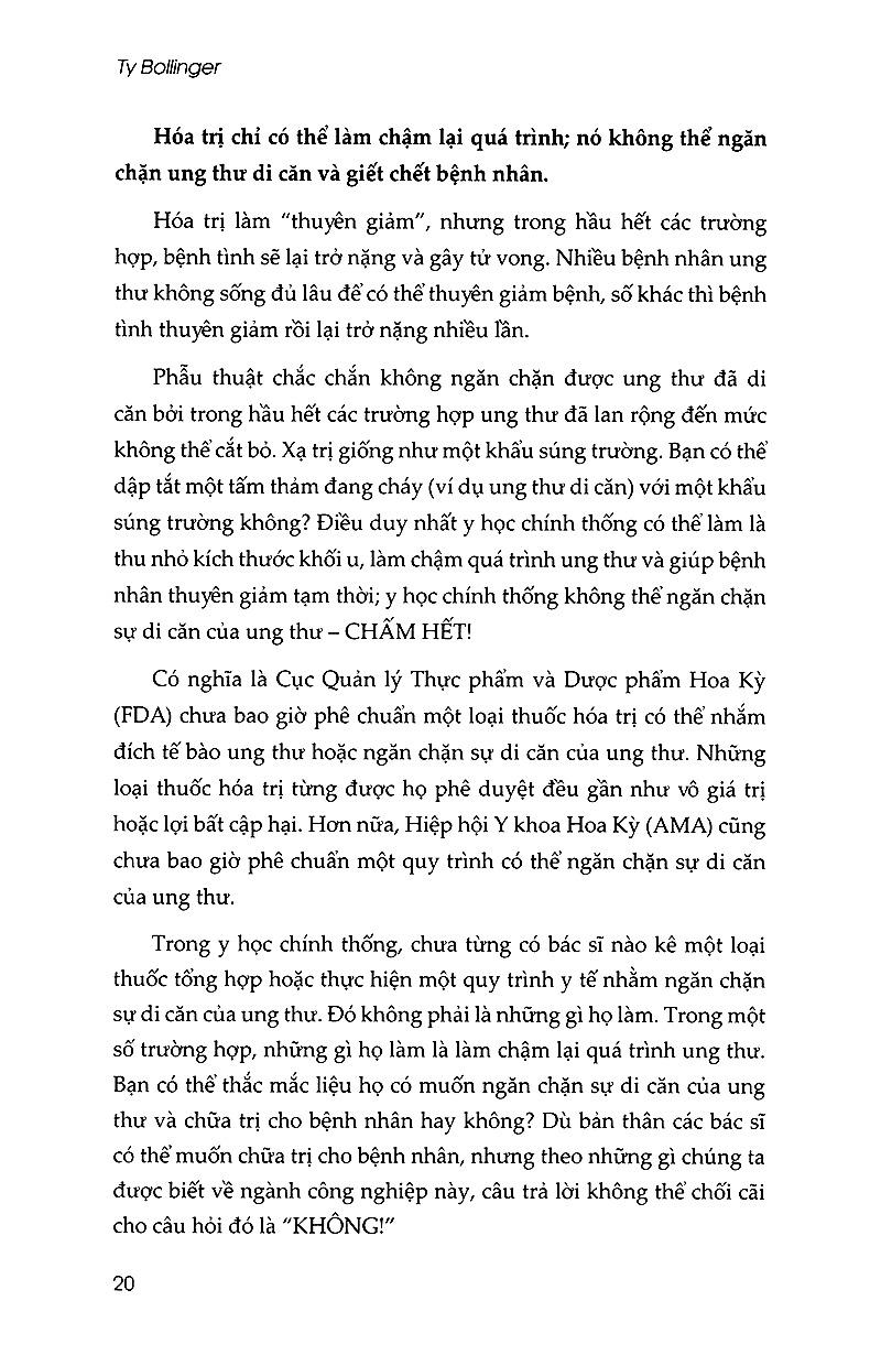 Cuốn sách có nhiều thông tin quan trọng được sắp xếp theo cách rất dễ đọc, bạn không thể tìm thấy lượng thông tin phong phú như thế ở bất cứ nơi nào khác. Theo tôi, cho đến thời điểm này, đây là cuốn sách đánh giá đầy đủ và thích đáng nhất các liệu pháp đ.iều trị ung thư thay thế. Cuốn sách đã được tái bản sáu lần ở Mỹ, nhận được sự hưởng ứng của đông đảo độc giả tại Mỹ và các nước khác trên thế giới. Vì khối kiến thức to lớn trong nội dung cuốn sách có thể mang những điều bổ ích đến cho bệnh nhân trong đ.iều trị ung thư và cho tất cả những người khỏe mạnh trong phòng ngừa bệnh ung thư, bạn nên đọc cuốn sách này.