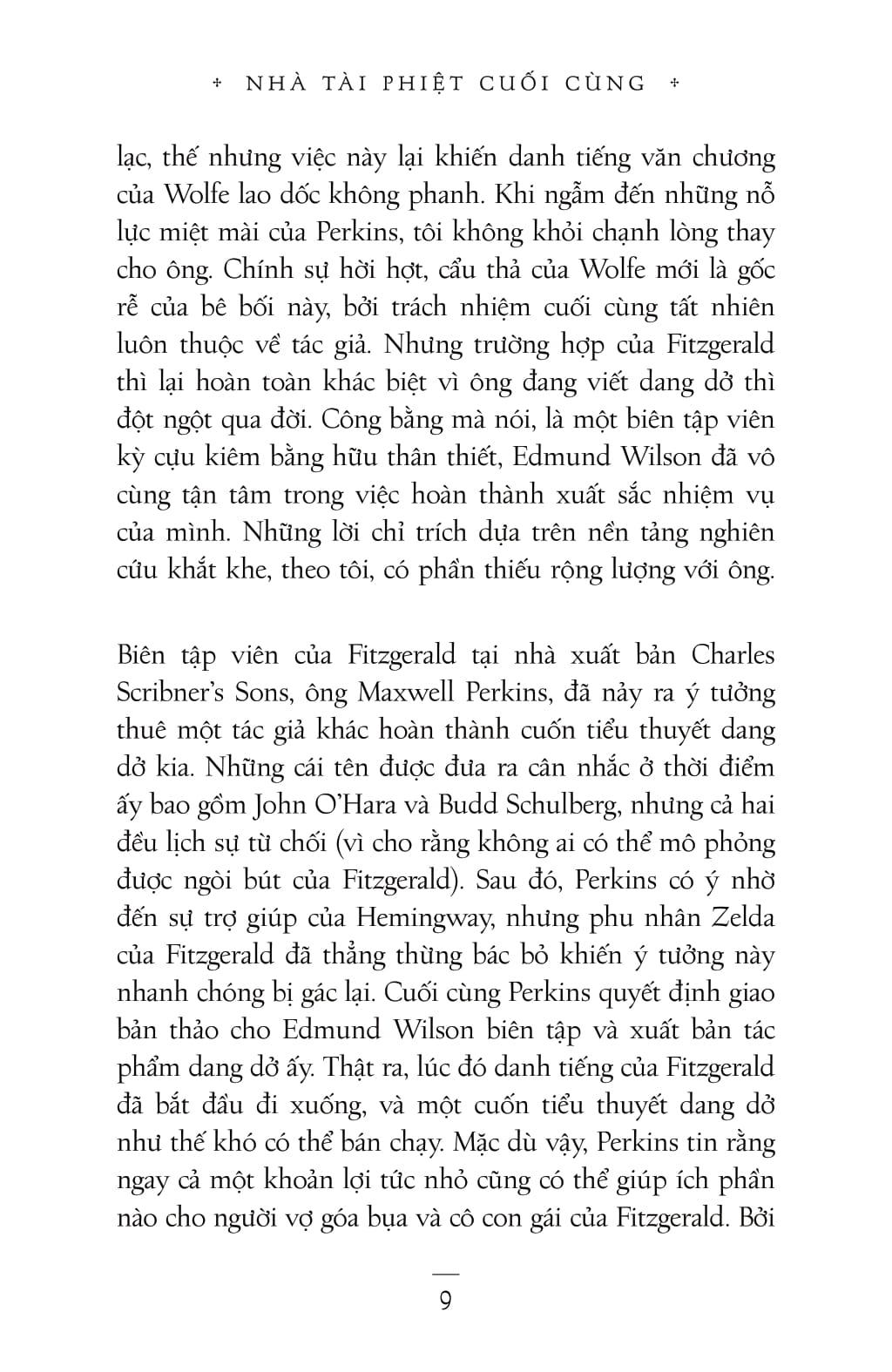 Dù chưa được toàn tác do sự ra đi đột ngột của tác giả, song “Nhà tài phiệt cuối cùng” vẫn phơi bày trọn vẹn trước mắt người đọc một Hollywood mê hoặc, đầy màu sắc, nơi mà sự lấp lánh của màn bạc che giấu đi những tham vọng, quyền lực, và nỗi ám ảnh về sự vô thường của cuộc sống cùng những câu hỏi về số phận con người. Liệu rằng thành công có phải là tất cả? Và khi đã đạt được đỉnh cao danh vọng, con người ta còn gì để khát khao?