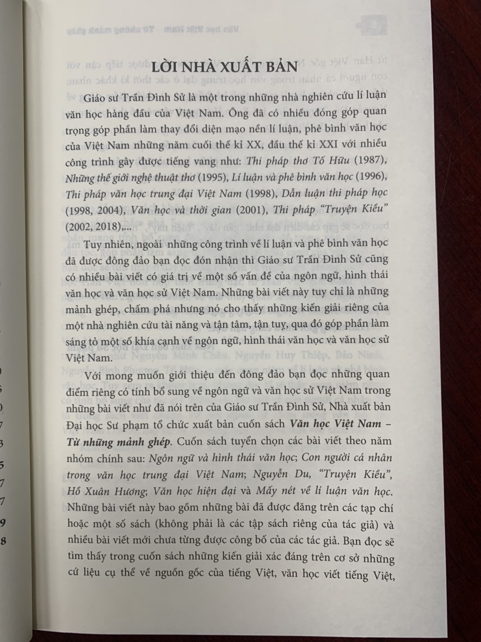 Cuốn sách tuyển chọn các bài viết theo năm nhóm chính sau: Ngôn ngữ và hình thái văn học; Con người cá nhân trong văn học trung đại Việt Nam; Nguyễn Du, “Truyện Kiều”, Hồ Xuân Hương; Văn học hiện đại và Mấy nét về lí luận văn học. Những bài viết này bao gồm những bài đã được đăng trên các tạp chí hoặc một số sách (không phải là các tập sách riêng của tác giả) và nhiều bài viết mới chưa từng được công bố của các tác giả. Như nhan đề tập sách đã thể hiện, các vấn đề trong sách không được trình bày hệ thống mà chỉ là những mảnh ghép, chấm phá. Song tuy là chấm phá, nhưng có những điểm nhấn mang tính bổ sung đối với một số vấn đề trong nền văn học dân tộc, góp phần làm sáng tỏ thêm một số khía cạnh của văn học sử. Bạn đọc sẽ tìm thấy ở đây những bài bàn về ngôn ngữ, phong cách văn học Hán Việt hỗn hợp thời trung đại, từ Hán Việt gốc Nhật, quan niệm về con người cá nhân, sự đổi thay quan niệm về con người này trong văn học thời trung đại, đóng góp của Nguyễn Du, về đoạn kết của Truyện Kiều,; tình trạng và tên gọi của một số thể loại văn học Việt Nam hiện đại, các thành tựu đổi mới văn học của một số tác giả tiêu biểu như Nguyễn Minh Châu, Nguyễn Huy Thiệp, Bảo Ninh, Nguyễn Bình Phương, Tố Hữu,; mấy quan niệm về lí luận và phê bình văn học. Tuy xem ra không lạ gì, nhưng đọc kĩ sẽ thấy quan niệm riêng có tính bổ sung của tác giả.