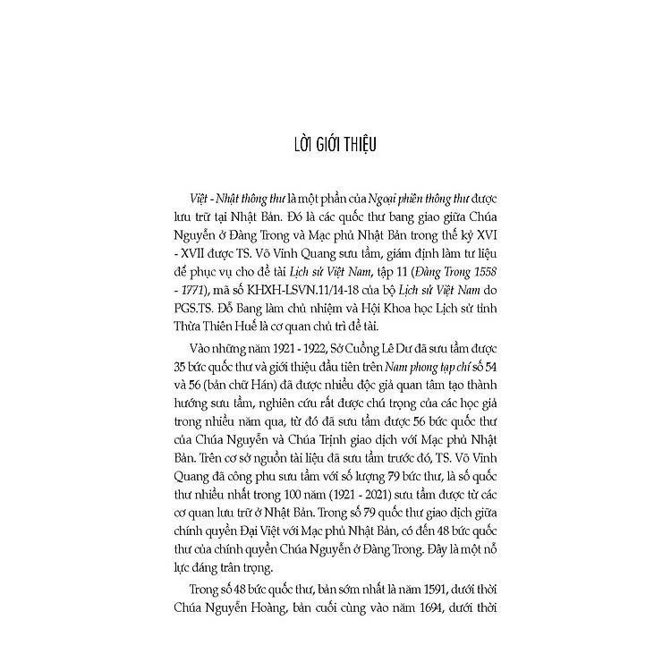 Mua tại TiktokSách - Việt Nhật Thông Thư - Các Bức Quốc Thư Bang Giao Giữa Chính Quyền Đàng Trong Với Nhật Bản Thế Kỷ XVI - XVII "Việt-Nhật thông thư" là một phần của Ngoại phiên thông thư được lưu trữ tại Nhật Bản. Đó là các quốc thư bang giao giữa Chúa Nguyễn ở Đàng Trong và Mạc phủ Nhật Bản trong thế kỷ XVI - XVII được TS. Võ Vinh Quang sưu tầm, giám định làm tư liệu để phục vụ cho đề tài Lịch sử Việt Nam, tập 11 (Đàng Trong 1558-1771), mã số KHXH-LSVN.11/14-18 của bộ Lịch sử Việt Nam do . Đỗ Bang làm chủ nhiệm và Hội Khoa học Lịch sử tỉnh Thừa Thiên Huế làm cơ quan chủ trì đề tài. Trong 79 quốc thư giao dịch giữa Chính quyền Đại Việt với Mạc phủ Nhật Bản, có đến 48 bức quốc thư của chính quyền Chúa Nguyễn ở Đàng Trong.