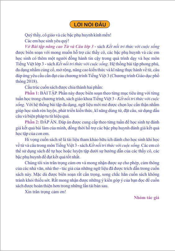 Hi vọng cuốn sách sẽ là tài liệu tham khảo hữu ích dành cho học sinh khi học về từ và câu trong môn Tiếng Việt 3 - sách Kết nối tri thức với cuộc sống. Các em có thể sử dụng sách để tự học hoặc luyện tập dưới sự hướng dẫn của các thầy cô, các bậc phụ huynh để đạt kết quả tốt nhất.