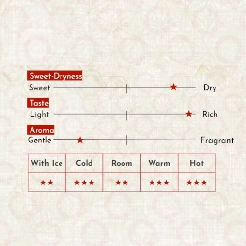 NGƯỜI DƯỚI 18 TUỔI KHÔNG ĐƯỢC UỐNG RƯỢU, BIA Xuất xứ: Nhật Bản Thành phần: Gạo, nước, men rượu Hàm lượng Ethanol: 14.7% Hướng dẫn sử dụng: Uống trực tiếp, uống nóng hoặc lạnh Hướng dẫn bảo quản: Bảo quản