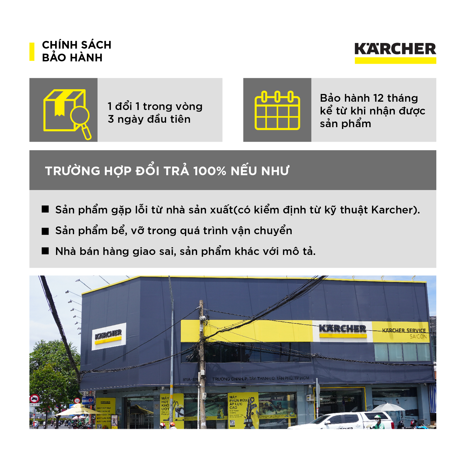 - Tất cả các sản phẩm máy làm sạch, máy hút bụi, máy rửa xe áp lực cao, máy hút bụi sàn nhà được bảo hành từ 1 năm trở lên. Kärcher sẽ lựa chọn thay thế, sửa chữa cho khách hàng khi có vấn đề với máy móc.