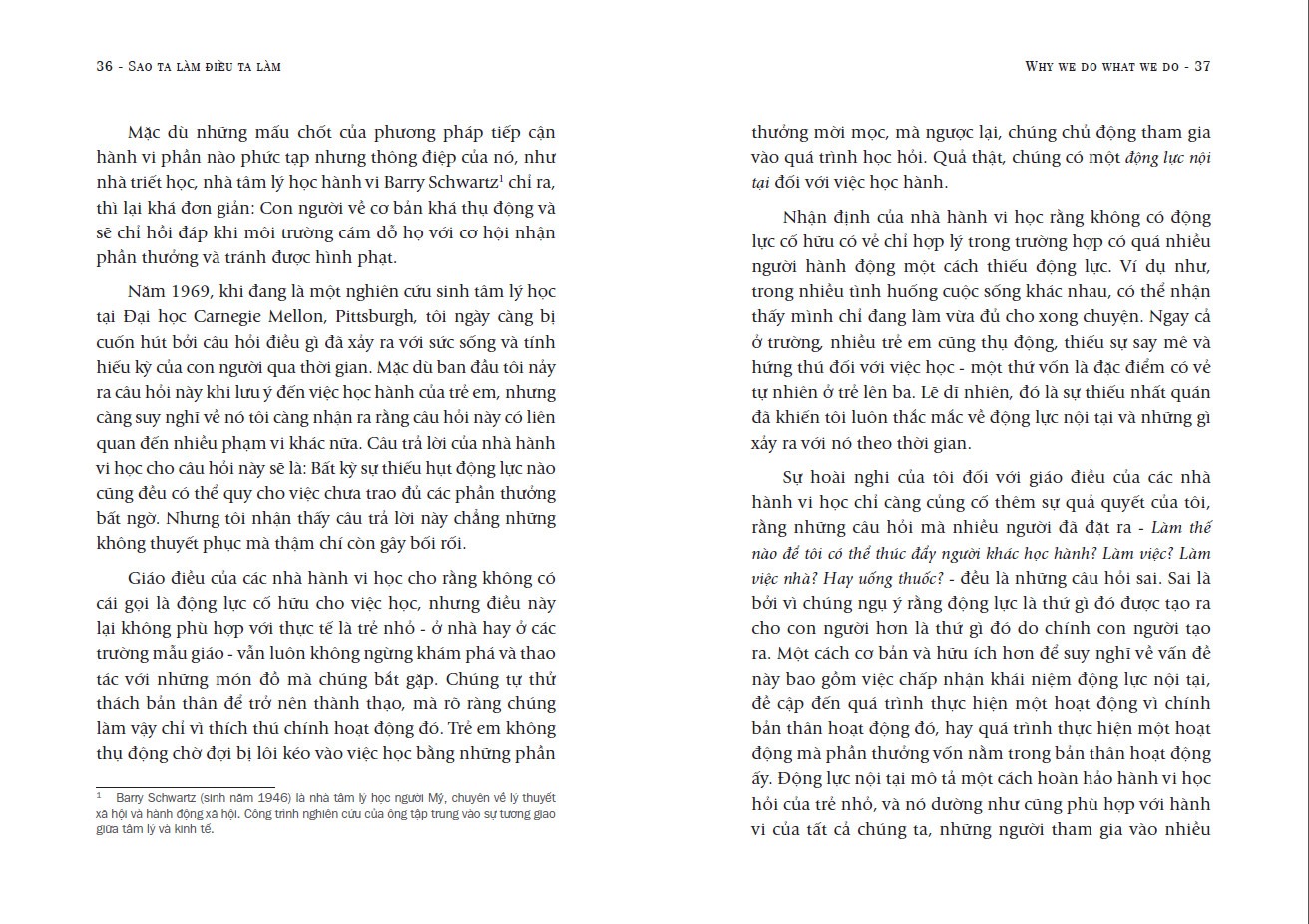 Sao Ta Làm Điều Ta Làm Thấu hiểu động lực; Giải mã hành vi; Làm chủ cuộc đời – Quyển sách chứa đựng hy vọng, cho biết những gì chúng ta có thể làm với chính mình Liệu rằng, mọi quyết định mà bạn đưa ra trong từng giai đoạn của cuộc đời có chính là từ niềm yêu thích, sự thôi thúc từ bên trong hay bị chi phối bởi các tác nhân bên ngoài? Đứng trước những ngã rẽ của cuộc đời, chúng ta luôn vật lộn để đưa ra những lựa chọn. Khó phân định đâu là quyết định xuất phát từ việc bản thân muốn “chọn làm”, đâu là những quyết định bị kiểm soát “phải làm”. Bắt nguồn từ trăn trở tương tự về việc tự chủ hay bị kiểm soát,  Edward L. Deci cùng cộng sự của mình đặt ra câu hỏi: Tại sao trẻ em chào đời với thiên hướng khát khao học hỏi, chúng tò mò và hiếu kỳ với tất cả mọi thứ, thế nhưng tính hiếu kỳ và năng lực học hỏi này dần suy giảm khi bọn trẻ bước vào môi trường học đường? Bằng những nghiên cứu và quan sát của mình, Edward L. Deci đã cho ra đời quyển sách “Sao ta làm điều ta làm”, nhằm giúp giải quyết những trăn trở về động lực thúc đẩy hành vi con người thông qua các nghiên cứu về khía cạnh nền tảng của Tâm lý học hành vi: Động lực. Edward L. Deci trình bày về động lực nội tại của con người xoay quanh sự phân biệt quan trọng trong hành vi, giữa việc nó là tự chủ hay bị kiểm soát. Tự chủ là hành động đúng theo cái tôi của bản thân, nghĩa là cảm thấy tự do và tự nguyện khi hành động. Ngược lại, bị kiểm soát nghĩa là hành động vì phải chịu áp lực. Khi bị kiểm soát, con người hành động mà không cảm thấy có sự tán thành của bản thân. Lúc này, những hành vi của họ không phải là biểu hiện của cái tôi, vì cái tôi đã bị kiểm soát và khuất phục. Một hành vi được coi là lành mạnh, hiệu quả và có khả năng tự duy trì phải đến từ một động lực nội tại có tính tự chủ, hợp nhất với cái tôi của mỗi người. Hoạt động tự chủ đòi hỏi rằng một điều lệ hay quy tắc được nội hóa phải được chấp nhận là của bản thân bạn; điều lệ đó phải trở thành một phần trong bạn. “Yếu tố then chốt để xác định liệu con người có đang sống một cách tự chủ hay không là liệu họ có cảm thấy, tận sâu bên trong, rằng những hành động của họ là lựa chọn của chính họ hay không.”, Edward L. Deci nhấn mạnh. Có nhiều hiểu lầm về những thứ có thể tạo động lực cho hành vi con người, trong đó hai hiểu lầm cơ bản nhất là phần thưởng và hình phạt. Hình phạt hiển nhiên là thứ có tính kiểm soát, và vì vậy nó làm xói mòn động lực. Nhưng trái với suy nghĩ của nhiều người, phần thưởng là động lực bên ngoài, và nó cũng làm suy yếu động lực nội tại – sức sống, sự tự nguyện, tính chân thật và hiếu kỳ vốn nằm trong bản chất của con người. Qua 13 chương sách, Edward L. Deci cùng cộng sự Richard M. Ryan, bước đầu xác định những điểm đối lập của sự tự chủ và bị kiểm soát, từ đó chỉ ra tầm quan trọng của tính tự chủ, nhu cầu tự chủ trong mỗi con người. Từ những nghiên cứu về động lực để xem xét mối quan hệ giữa sự tự chủ với trách nhiệm, khám phá sự khác biệt giữa động lực nội tại và ngoại tại, Edward L. Deci dẫn dắt độc giả một lần nữa suy ngẫm vấn đề thúc đẩy tính trách nhiệm trong cuộc sống, duy trì tính tự chủ giữa vô vàn sự kiểm soát để hướng đến cuộc sống tự do, hạnh phúc.  “Cuốn sách này chứa đầy hy vọng, vì nó cho biết những gì chúng ta có thể làm cho chính mình, cho con cái, nhân viên, bệnh nhân, học sinh và các vận động viên của chúng ta - đúng hơn là những gì chúng ta có thể làm cho xã hội”, tác giả khẳng định. “Sao ta làm điều ta làm” không phải thần dược có khả năng cứu chữa cho cuộc đời của bất cứ ai, mà với những quan sát của mình, Edward L. Deci đã đưa ra các giải pháp hữu hiệu để giải quyết các vấn đề trăn trở trong hành vi con người. Theo ông, các giải pháp này tương thích với mỗi cá nhân trong việc quản lý bản thân, và chúng có thể áp dụng cho các vai trò giáo viên, nhà quản lý, cha mẹ, bác sĩ và huấn luyện viên. Cách “chữa bệnh” bắt đầu từ việc hiểu về động lực của con người - ở mức độ có tính tự chủ và sử dụng những hiểu biết đó để quản lý bản thân hiệu quả hơn, kết nối và tạo ra những mối quan hệ bền chặt hơn, thúc đẩy sự tự chủ lành mạnh của bản thân và những người xung quanh để kiến tạo một cuộc sống ý nghĩa. Tiến sĩ Edward L. Deci sinh năm 1942, là giáo sư tâm lý học và là giám đốc chương trình động lực con người ở Đại học Rochester. Cùng với Richard Ryan, Edward L. Deci đã xây dựng Lý thuyết về tự quyết (SDT – self-determination theory). SDT là học thuyết vĩ mô về động lực con người và có sức ảnh hưởng lớn trong nhánh tâm lý học hành vi. Lý thuyết này 
