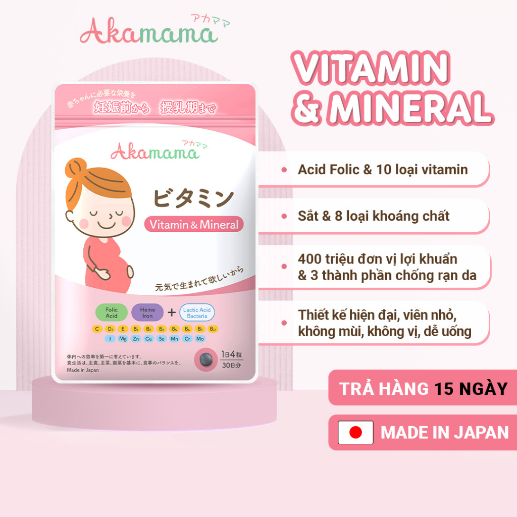 Ưu điểm nổ bật của viên uống Vitamin tổng hợp cho mẹ bầu Akamama Nhật Bản: Ưu điểm 1: Bổ sung đầy đủ 11 loại vitamin và 9 loại khoáng chất cần thiết cho thai kỳ với hàm lượng vừa đủ và an toàn cho th...
