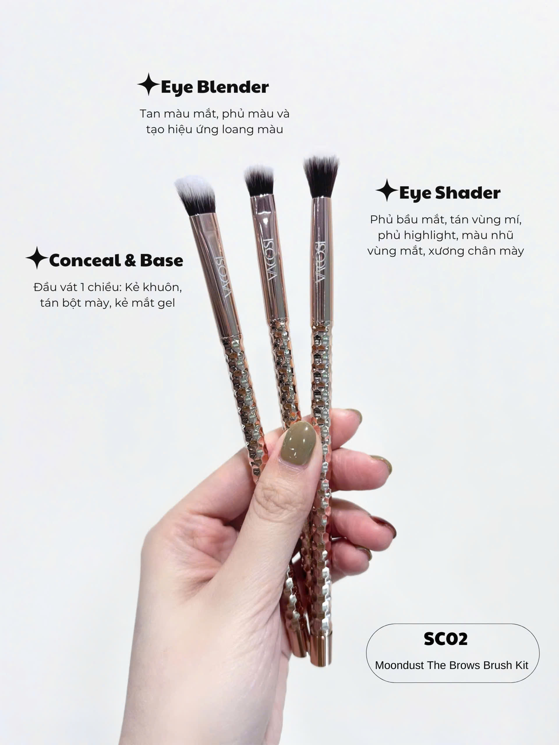 Bộ 3 cọ chuyên nghiệp dành makeup mắt, cọ viền mí ngắn, cọ tán smokey với đầu vát chóp cho hốc mắt sâu, và cọ bắt sáng đầu bung dẹt, mang lại vẻ đẹp mắt ấn tượng và sắc sảo.