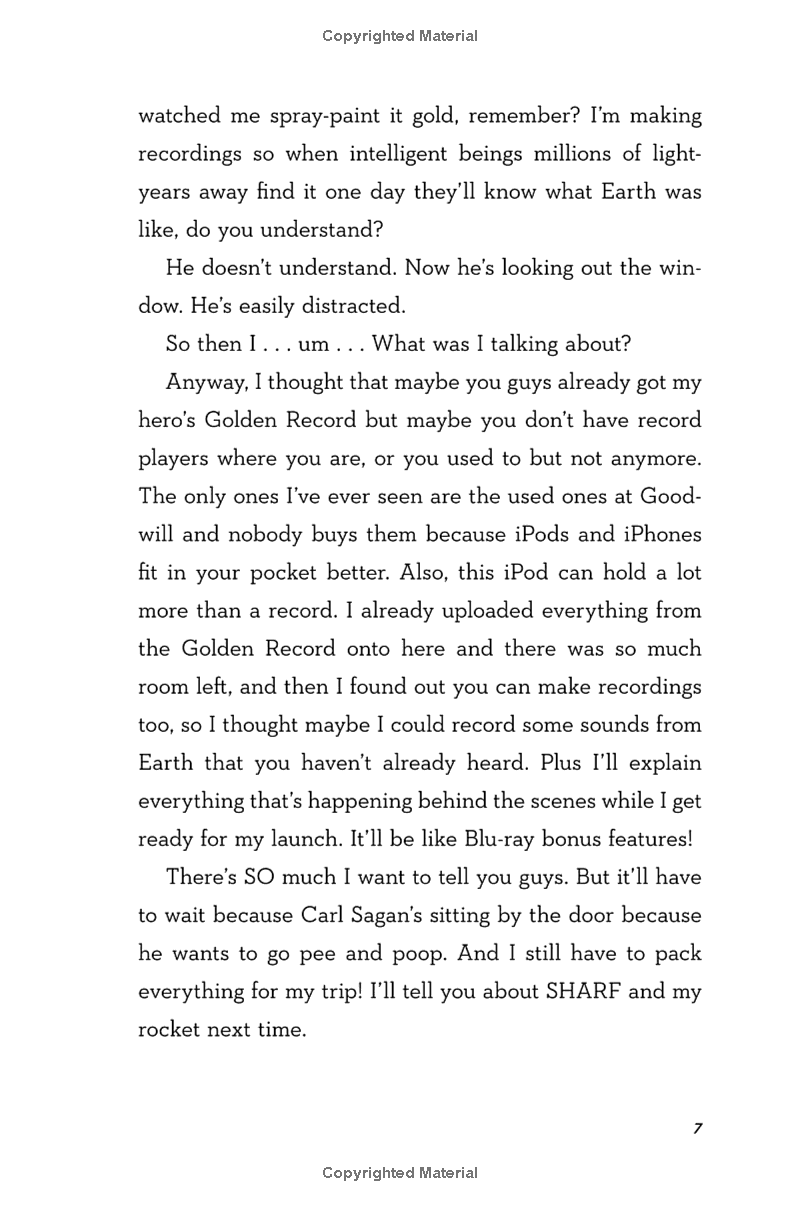 11-year-old Alex Petroski loves space and rockets, his mom, his brother, and his dog Carl Sagan--named for his hero, the real-life astronomer. All he wants is to launch his golden iPod into space the way Carl Sagan (the man, not the dog) launched his Golden Record on the Voyager spacecraft in 1977. From Colorado to New Mexico, Las Vegas to L.A., Alex records a journey on his iPod to show other lifeforms what life on earth, his earth, is like. But his destination keeps changing. And the funny, lost, remarkable people he meets along the way can only partially prepare him for the secrets he'll uncover--from the truth about his long-dead dad to the fact that, for a kid with a troubled mom and a mostly not-around brother, he has way more family than he ever knew.