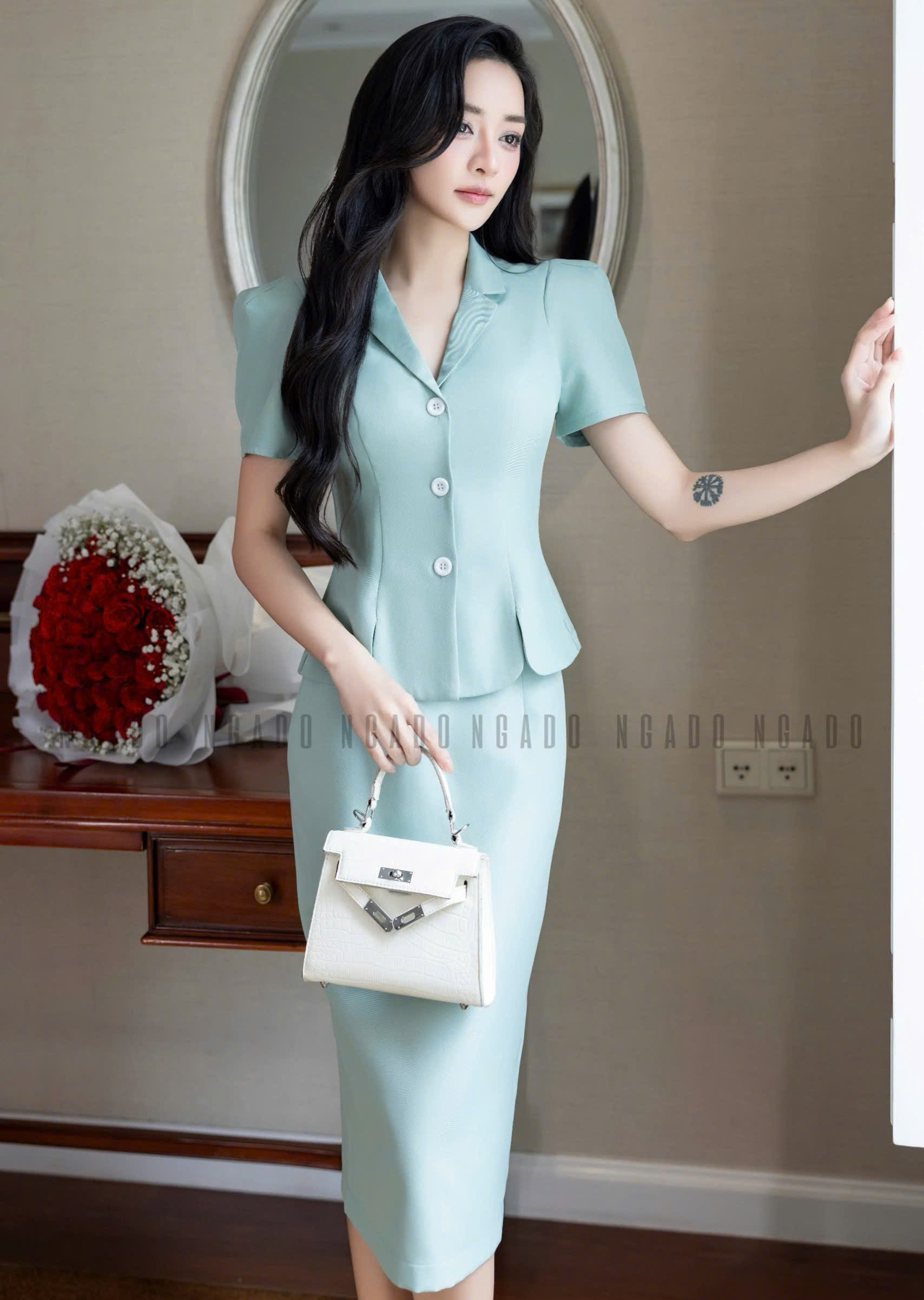 ✨Set áo váy xanh mint bút chì NGADO , set áo váy dài , set công sở
