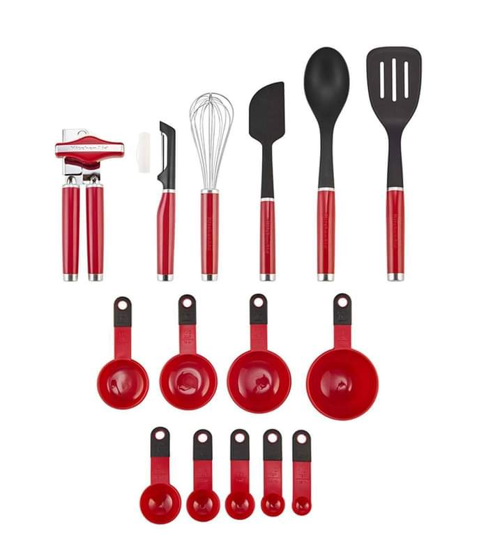 Bộ dụng cụ và tiện ích 15 món KitchenAid này bao gồm một dụng cụ xoay có rãnh, thìa phết, thìa cạo, dụng cụ gọt vỏ euro, dụng cụ mở hộp đa chức năng, máy đánh trứng tiện ích, bộ 4 cốc đo lường (1 cup, 1/2 cup, 1/3 cup, and 1/4 cup) và bộ 5 thìa đong (1 tablespoon, 1/2 tablespoon, 1 teaspoon, 1/2 teaspoon, and 1/4 teaspoon).