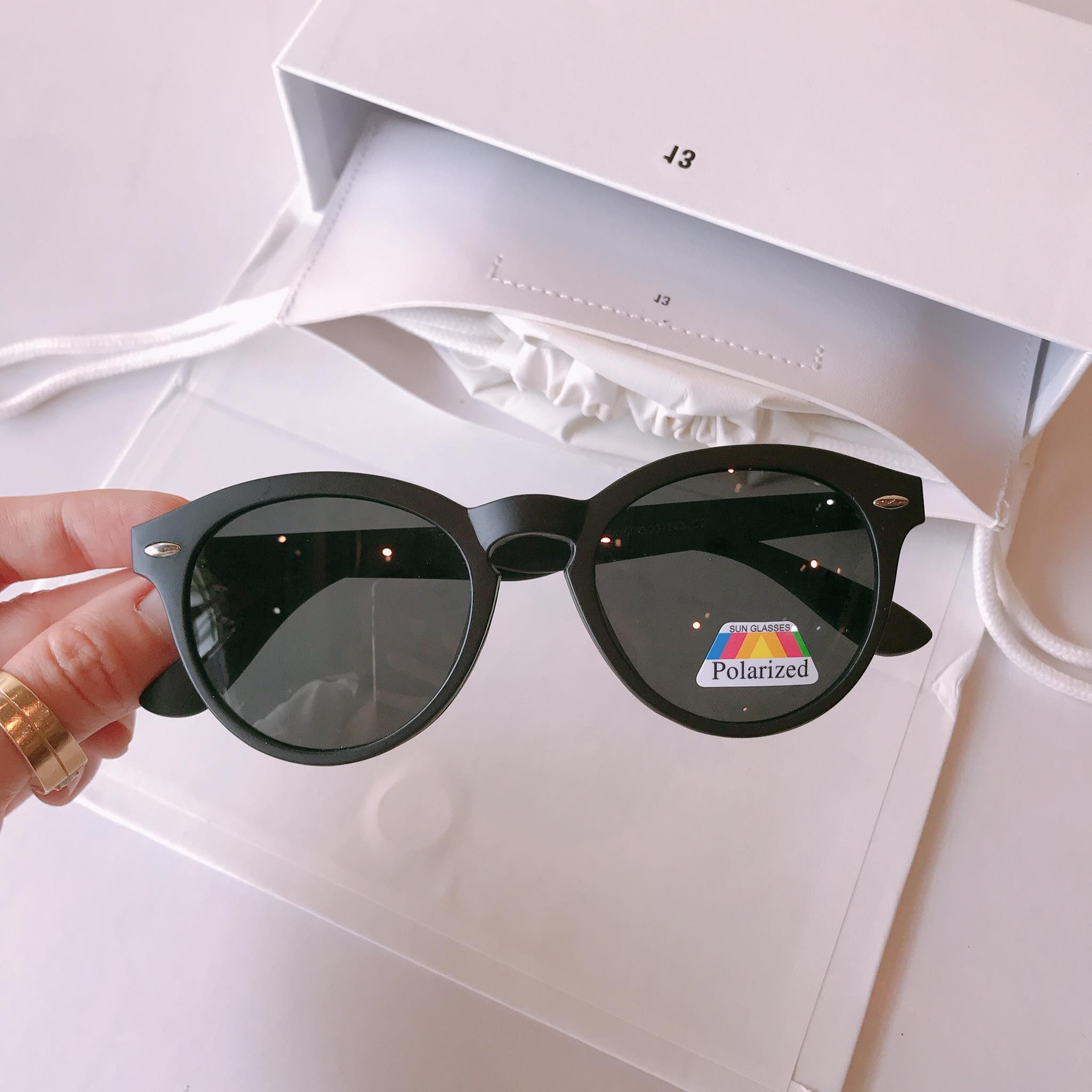 Mắt kính râm màu đen, gọng đen dễ đeo, không kén da, dễ kết hợp trang phục hàng ngày