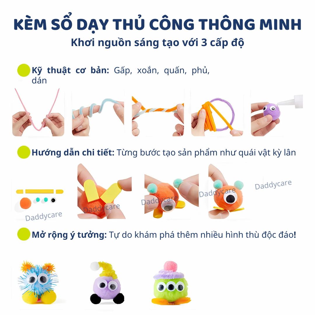 - HƠN 700+ NGUYÊN LIỆU THỦ CÔNG KẾT HỢP VÔ TẬN Bộ dụng cụ bao gồm các vật liệu phong phú như kẽm nhung, hạt pom pom, que kem, và nhiều loại khác nữa, đáp ứng mọi nhu cầu sáng tạo của trẻ.