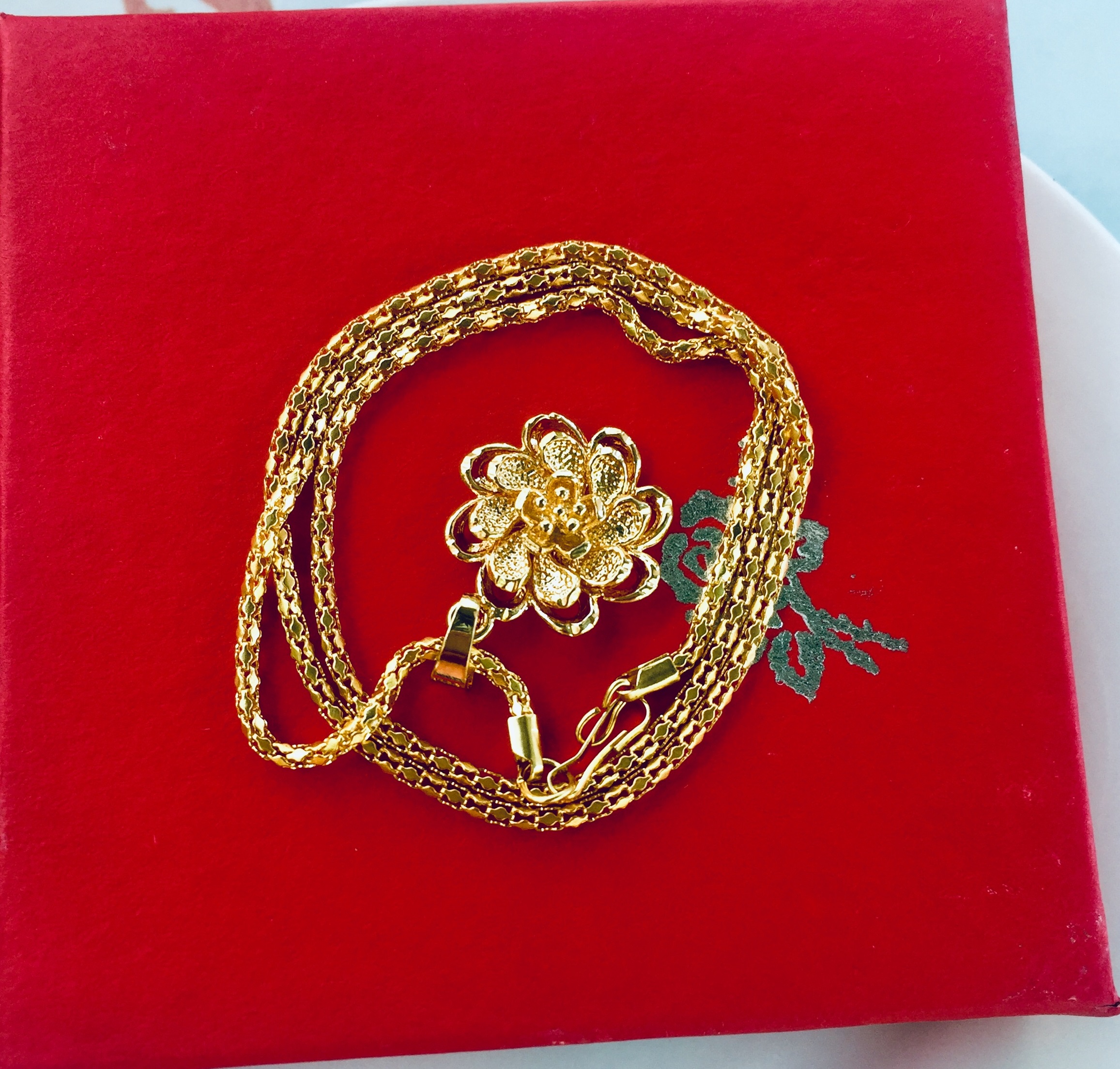 ✨Set Mặt Dây Chuyền Mạ Vàng 18K Đúc Hình Hoa Mai 4 Tầng, Kèm dây chuyền Mạ vàng 18K và hộp đựng trang sức.