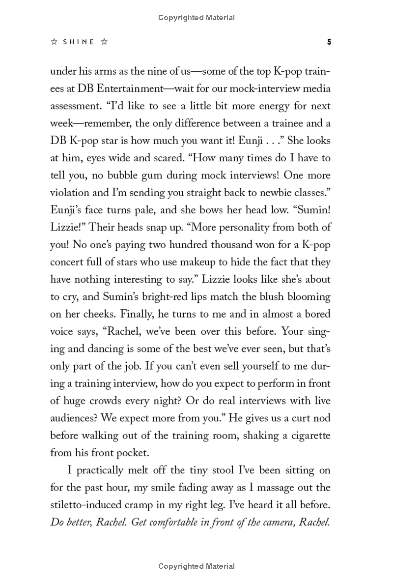 Not so much. As the dark scandals of an industry bent on controlling and commodifying beautiful girls begin to bubble up, Rachel wonders if she’s strong enough to be a winner, or if she’ll end up crushed… Especially when she begins to develop feelings for K-pop star and DB golden boy Jason Lee. It’s not just that he’s charming, sexy, and ridiculously talented. He’s also the first person who really understands how badly she wants her star to rise.