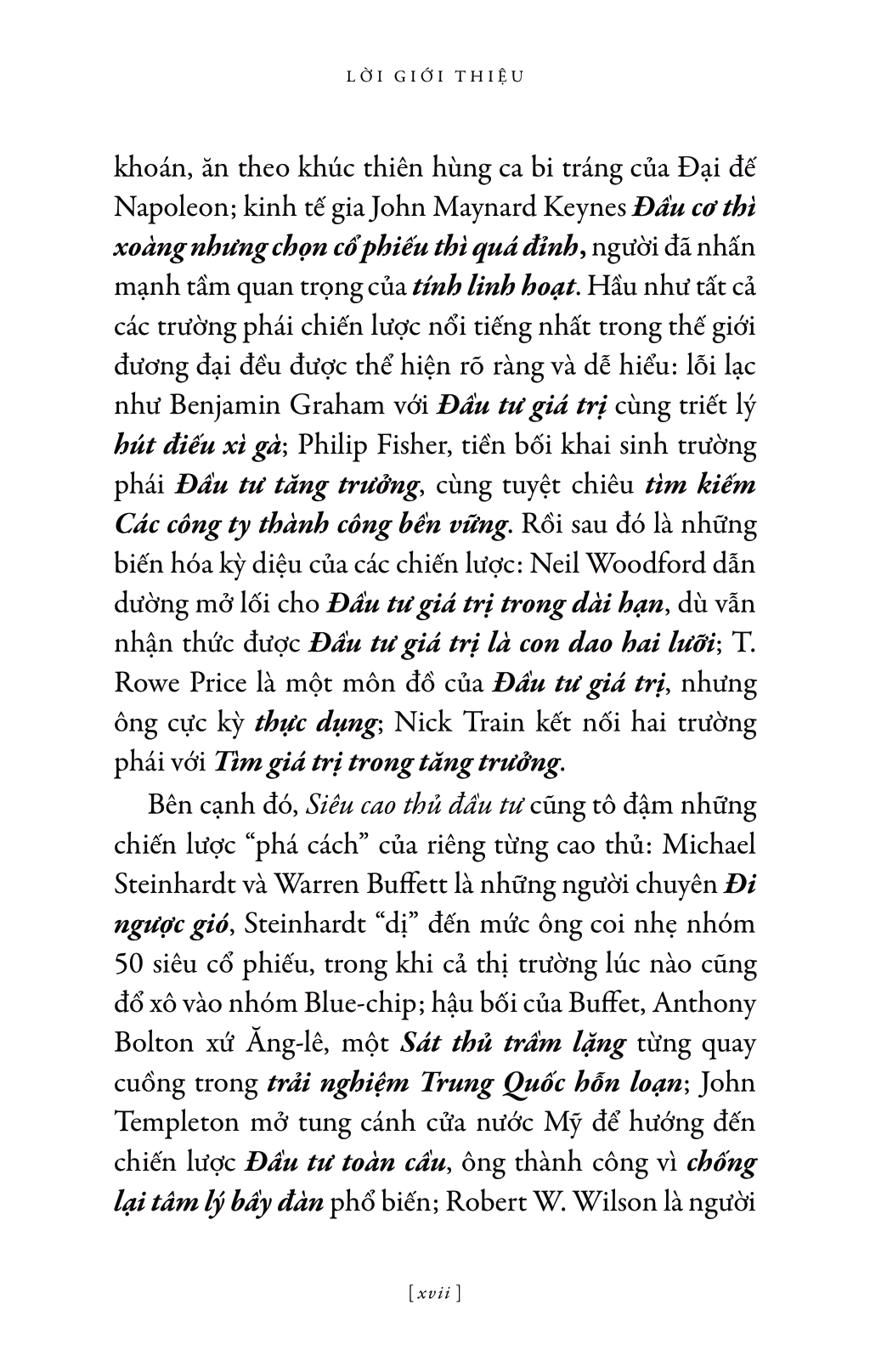 Sách thể hiện các hành động, tương tác của các nhà đầu tư với thị trường chứng khoán, trình bày phương pháp đầu tư của từng người, bao gồm những thương vụ đầu tư nổi bật, có điểm nhấn, những phi vụ nổi tiếng, từng gây chấn động thế giới. Ở cuối mỗi phần có phần tóm tắt các chiến lược súc tích, thuận lợi cho người đọc; có xếp hạng, chấm điểm nhà đầu tư ở cuối mỗi chương.