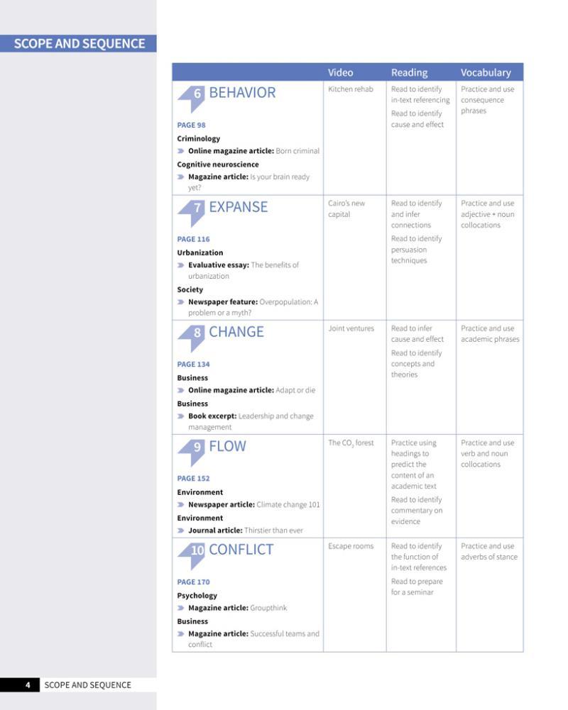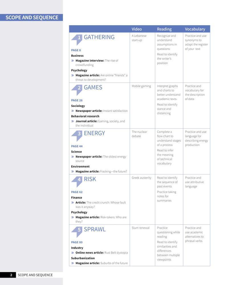 Each unit begins with a stunning visual as well as a discussion point and infographic to orient students and engage them with the unit’s theme. Each unit opening section contains authentic Reuters video, which presents engaging real-world topics to spark ideas and debate. The video can be streamed online or downloaded from the Student’s Resource Center. Unit topics mirror those in Skillful Listening & Speaking so both books can be used alongside each other.