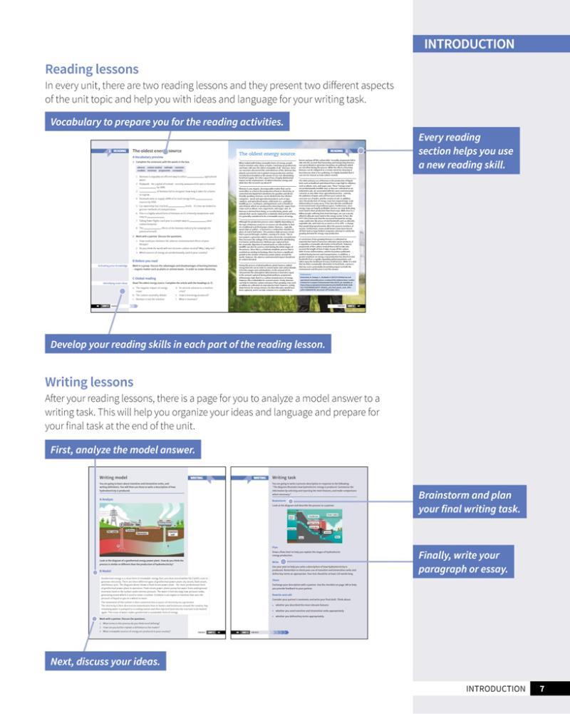 Skillful Reading & Writing helps teachers prepare their students for academic work in English by teaching not only language systems – grammar and vocabulary – but the necessary skills to engage with topics, texts and discourse with classmates. Students need to know how to do things: how to explain, persuade, outline and argue a thesis, distinguish between important and unimportant information, make transitions, identify cause and effect and more. Skillful acknowledges that acquiring these skills is not a matter of memorizing facts, but is rather a matter of students noticing them as they read, breaking them down and understanding them through clear explanations, and then practicing those skills in carefully scaffolded writing activities that lead to freer practice. There are also study skills pages within the units which teach students strategies they can use to improve their academic performance and build confidence for ongoing independent learning.