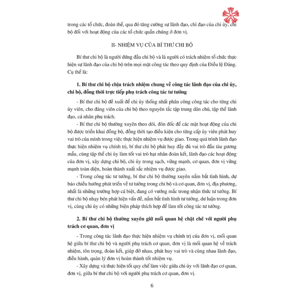 • Các trang mẫu sẵn ghi thông tin thu Đảng phí. Sổ ghi công văn đi, đến Phần 1 (Quy định về cách ghi công văn đi đến của chi bộ); Phần 2: trang mẫu sẵn ghi thông tin: Số thứ tự, ngày tháng, số công văn đi, đến; nội dung công văn… Sổ tay Bí thư Chi bộ và Chi ủy viên Phần 1 (Nâng cao chất lượng sinh hoạt chi bộ; Nhiệm vụ của Chi ủy và Bí thư Chi bộ; Một số văn bản, biểu mẫu của chi bộ thường sử dụng). Phần 2: trang trắng để ghi chép. Sổ tay đảng viên