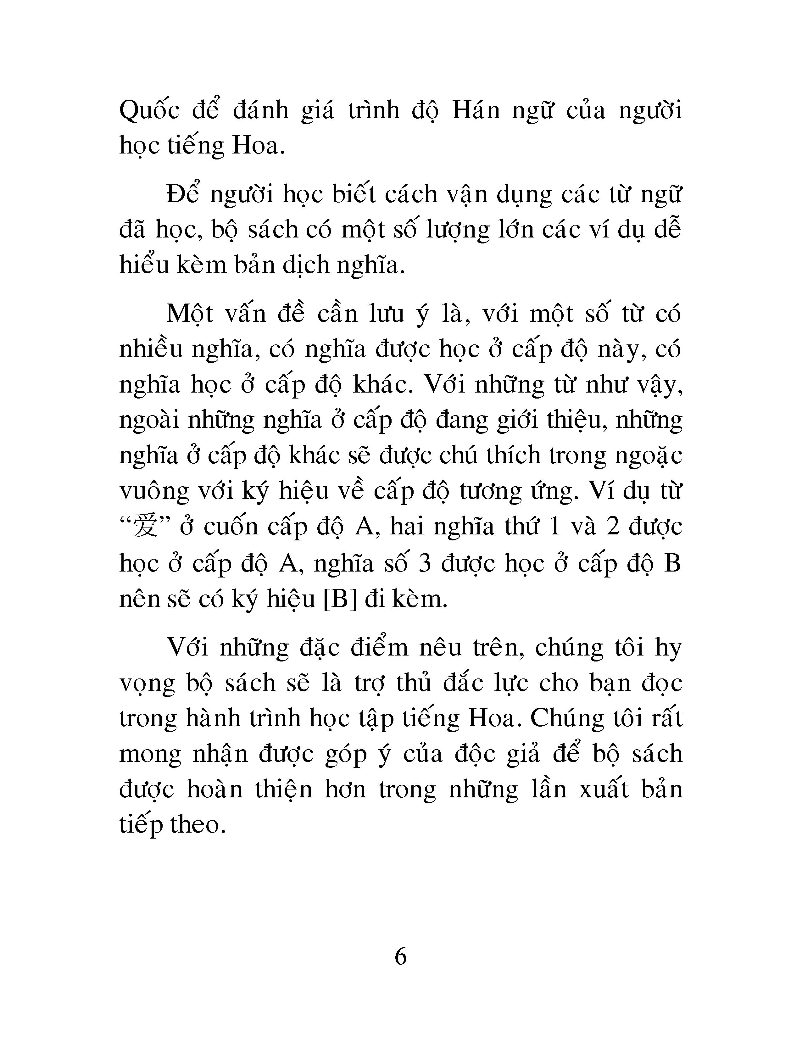 Với những đặc điểm nêu trên, chúng tôi hy vọng bộ sách sẽ là trợ thủ đắc lực cho bạn đọc trong hành trình học tập tiếng Hoa. Chúng tôi rất mong nhận được góp ý của độc giả để bộ sách được hoàn thiện hơn trong những lần xuất bản tiếp theo.