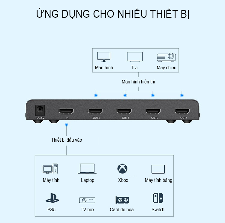 - Phân phối 1 đầu vào tín hiệu HDMI cho 4 đầu ra tín hiệu HDMI.